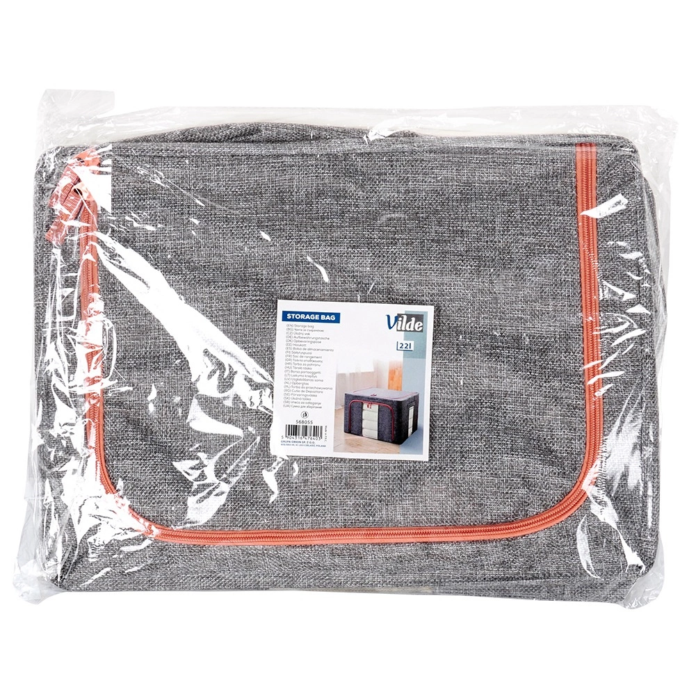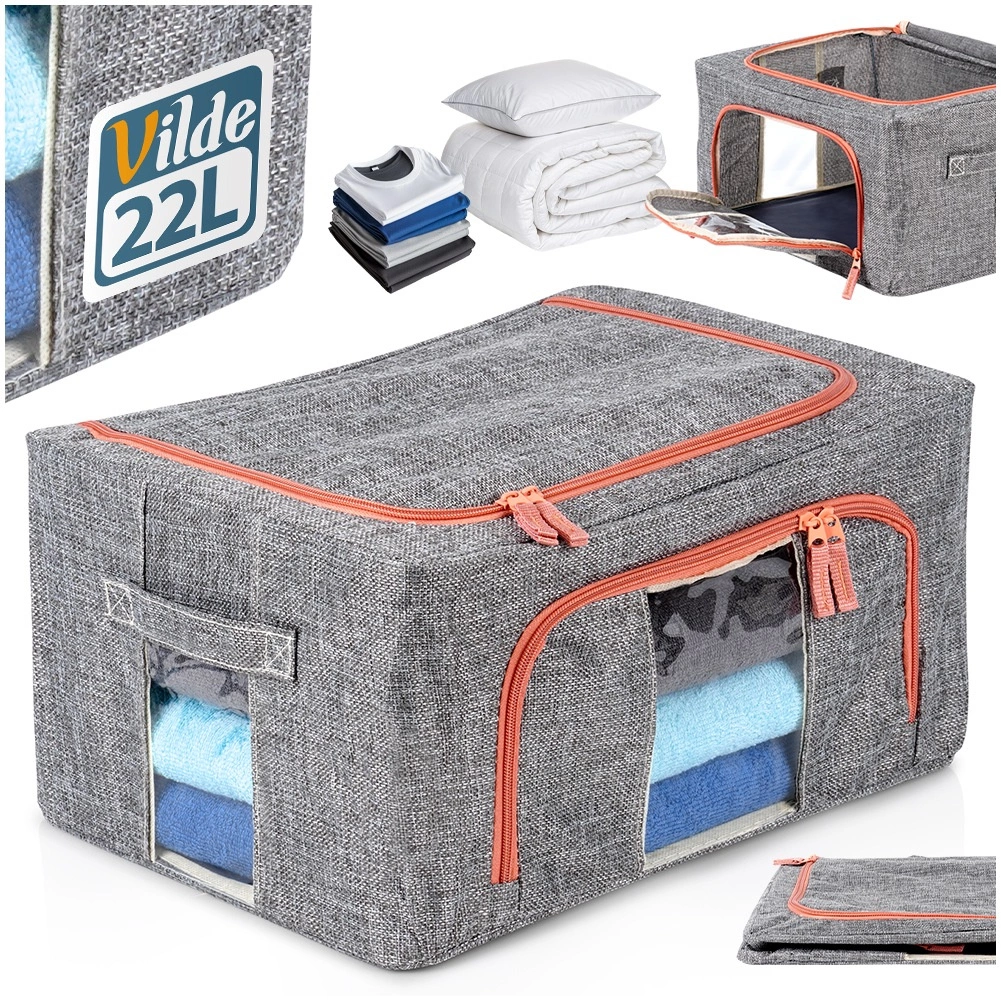 Utrzymaj porządek w szafie i pod łóżkiem. Wytrzymały tekstylny organizer z poliestru w szarym melanżu z kontrastowym zamkiem zapewnia czyste i bezpieczne przechowywanie pościeli oraz sezonowej odzieży. Przezroczyste okienko umożliwia natychmiastowy podgląd zawartości bez otwierania, a metalowa rama utrzymuje kształt, by pudełko się nie zapadało.