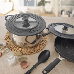 Silikonowa krawędź chroni brzegi naczyń i dobrze uszczelnia, a szklane centrum umożliwia kontrolę gotowania bez podnoszenia pokrywki.