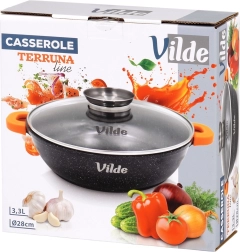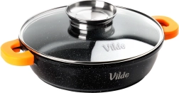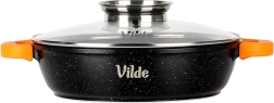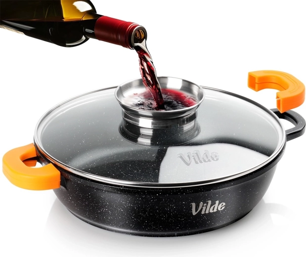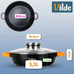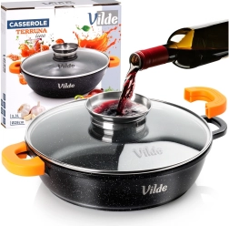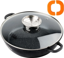 Głęboka patelnia 28 cm o pojemności 3,3 l jest idealna do codziennego gotowania: smażenia, duszenia, zapiekania, sosów, risotta, makaronów oraz dań jednogarnkowych. Wytrzymałe aluminiowe korpus z nieprzywierającą warstwą granitową umożliwia gotowanie z minimalną ilością tłuszczu i ułatwia czyszczenie. Szklana pokrywa dobrze przylega, a dzięki zintegrowanemu dozownikowi w uchwycie możesz dolewać wino lub wodę bez podnoszenia pokrywy.