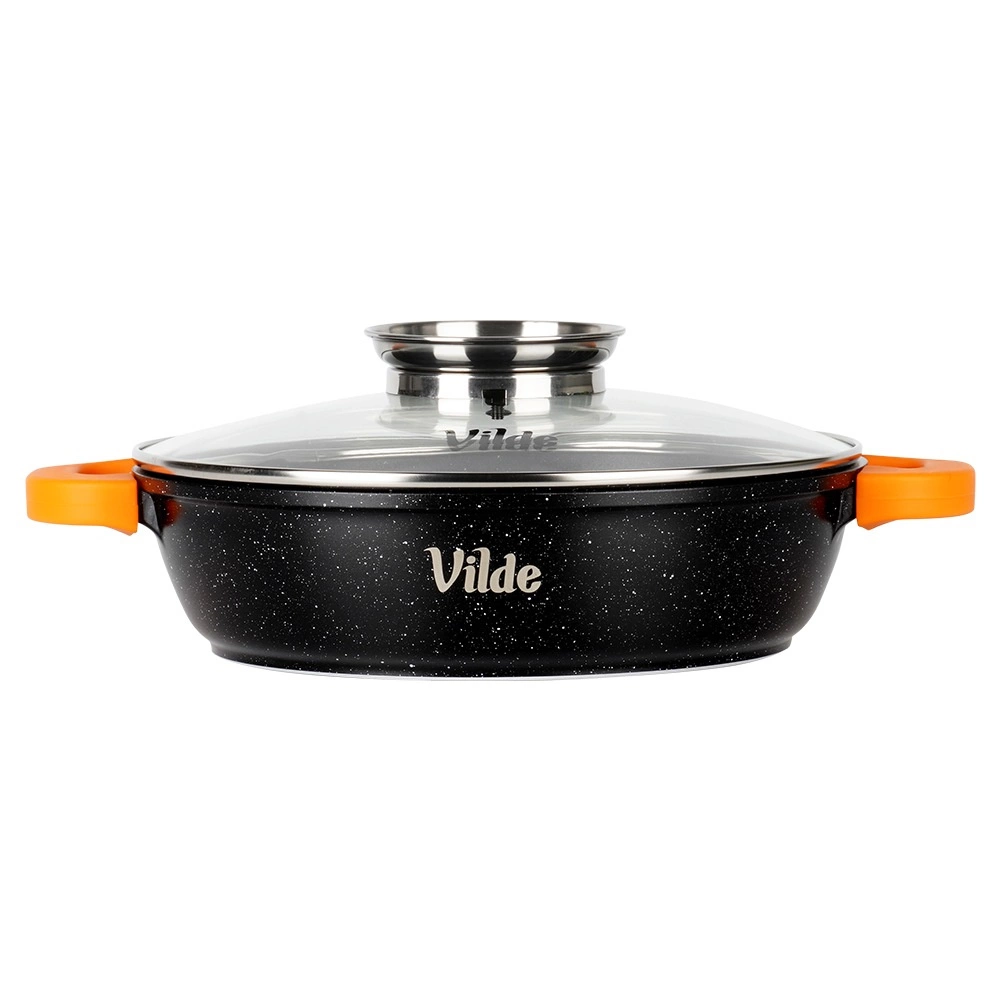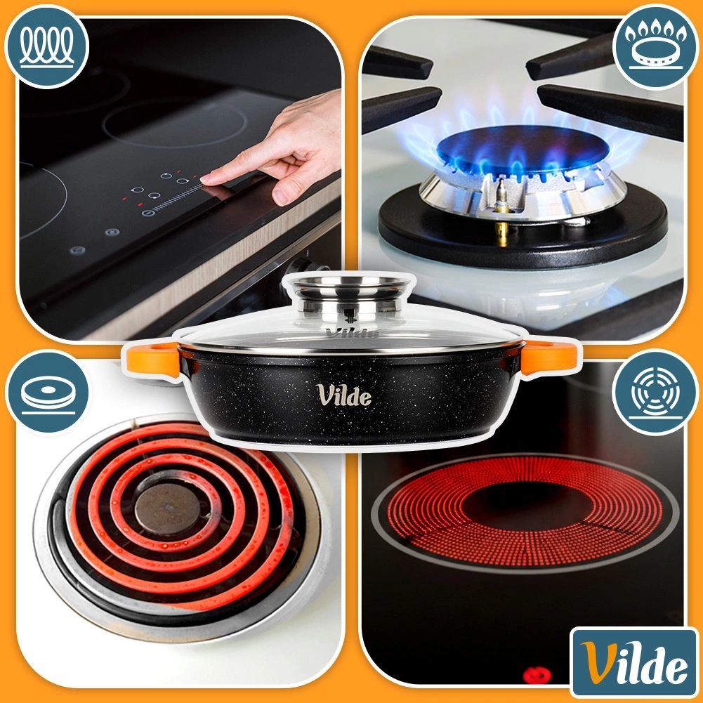 Praktyczne silikonowe nakładki w pomarańczowym kolorze zapewniają pewny chwyt i bezpieczną obsługę także w wysokich temperaturach. Patelnia jest kompatybilna ze wszystkimi typami kuchenek, w tym z indukcją, oraz może być używana w piekarniku do 200 °C (bez pokrywy). Elegancki wygląd pozwala serwować potrawy bezpośrednio na stół.