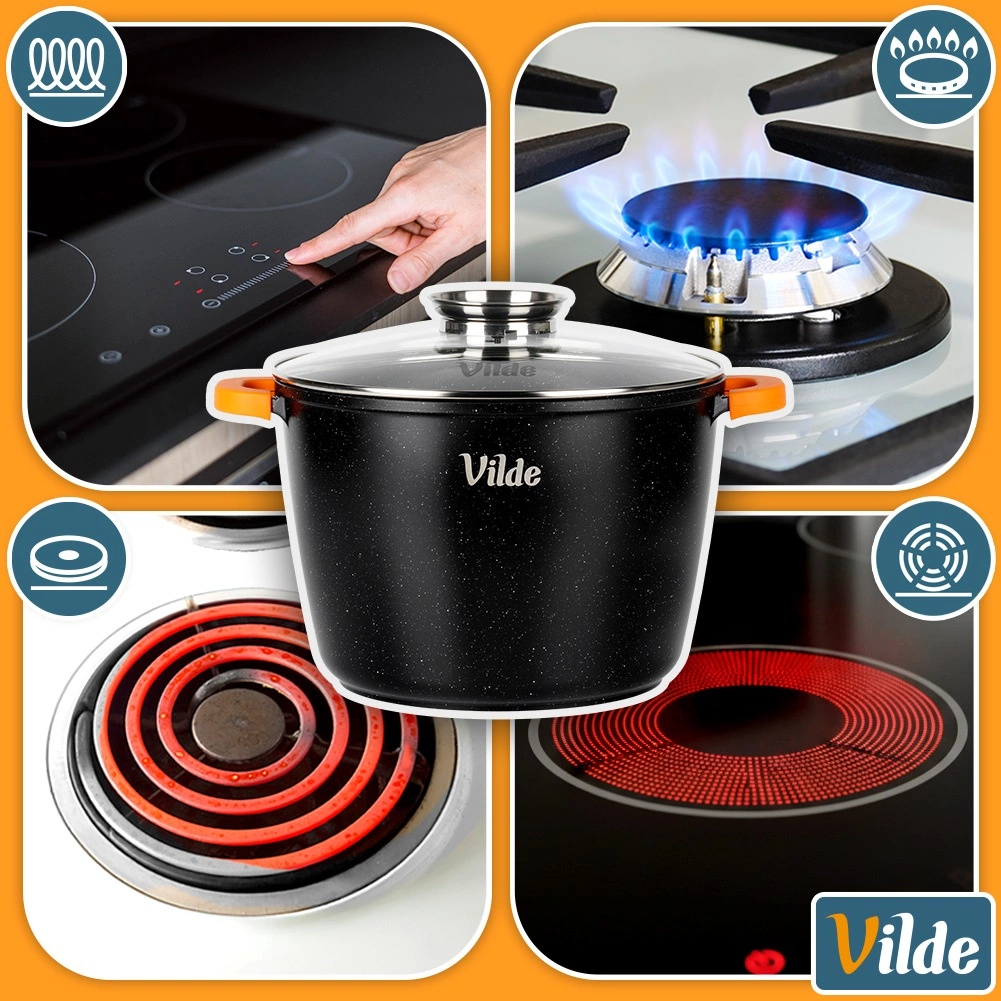 Wielowarstwowe dno z płytą indukcyjną zapewnia szybkie przewodzenie ciepła i równomierne gotowanie na kuchenkach gazowych, elektrycznych, ceramicznych i indukcyjnych.
