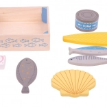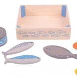 Ta drewniana skrzynka jest pełna świeżych i zdrowych ryb, takich jak łosoś, puszka tuńczyka i krewetka. Świetny dodatek do drewnianej kuchni dla wszystkich małych kucharzy. Bigjigs Toys drewniane jedzenie wspiera angażującą naukę o pochodzeniu i przygotowaniu jedzenia, poprawia motorykę dzieci i jednocześnie bawi.