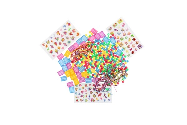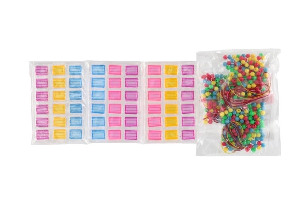 W opakowaniu znajdują się kwadratowe elementy, plastikowe koraliki w różnych kształtach i kolorach, elastyczne gumki oraz piankowe naklejki do wykończenia niepowtarzalnego stylu. Świetny wybór do twórczej zabawy w domu, na przyjęciach dla dzieci i jako prezent.