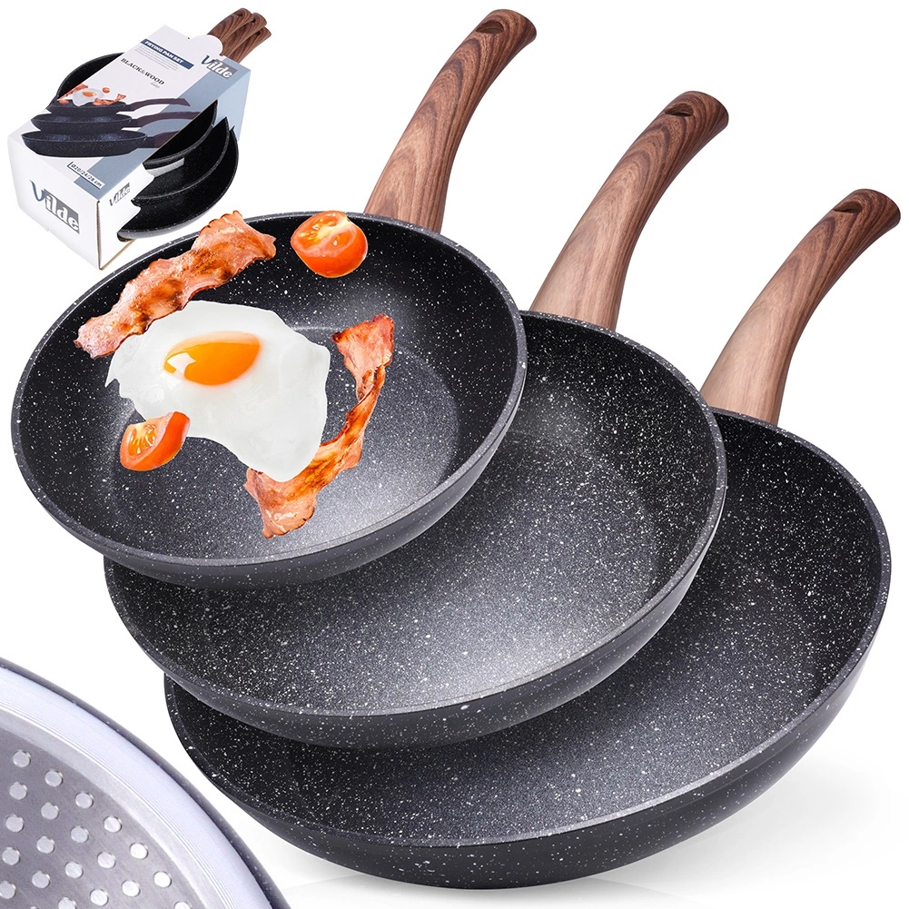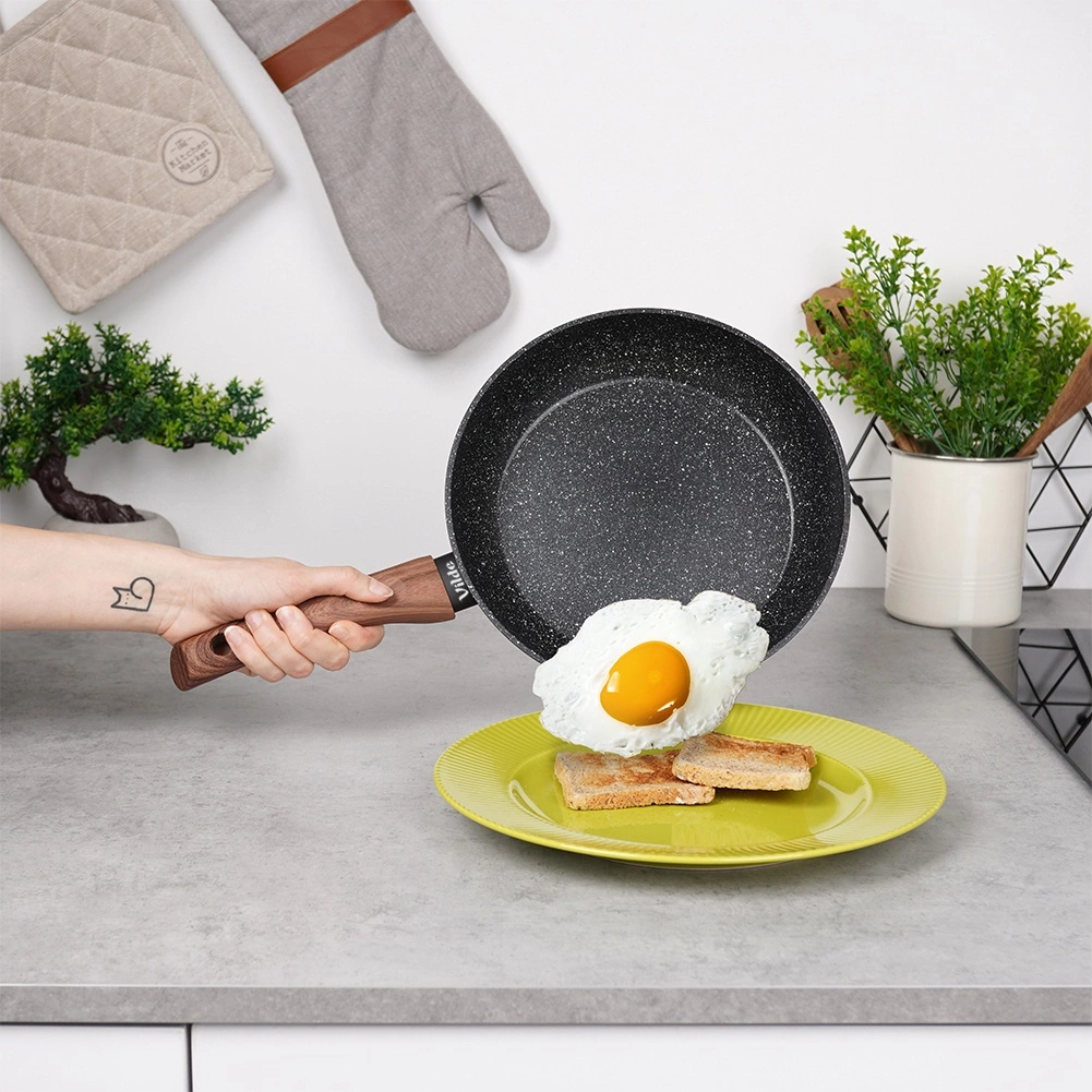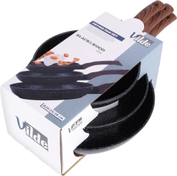 Zestaw patelni BLACK&WOOD łączy nowoczesny wygląd z praktycznością do każdej kuchni. Trzy uniwersalne rozmiary (20/24/28 cm) sprawdzą się przy szybkich śniadaniach, obiadach i rodzinnych kolacjach. Trwała, granitowa powłoka nieprzywierająca zapewnia płynne odchodzenie potraw, mniej przypaleń i łatwiejszą pielęgnację.