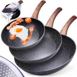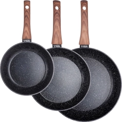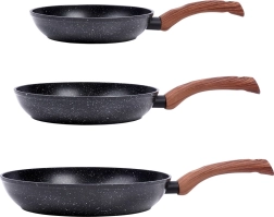 Stylowy zestaw trzech patelni o średnicach 20, 24 i 28 cm z trwałą granitową powłoką nieprzywierającą, równomiernym rozprowadzaniem ciepła oraz ergonomicznymi uchwytami z drewnianym dekorem. Odpowiednie do wszystkich typów kuchenek, w tym indukcji, łatwe w czyszczeniu i z możliwością mycia w zmywarce. Idealne do zdrowego gotowania z minimalną ilością tłuszczu oraz codziennego smażenia i duszenia.