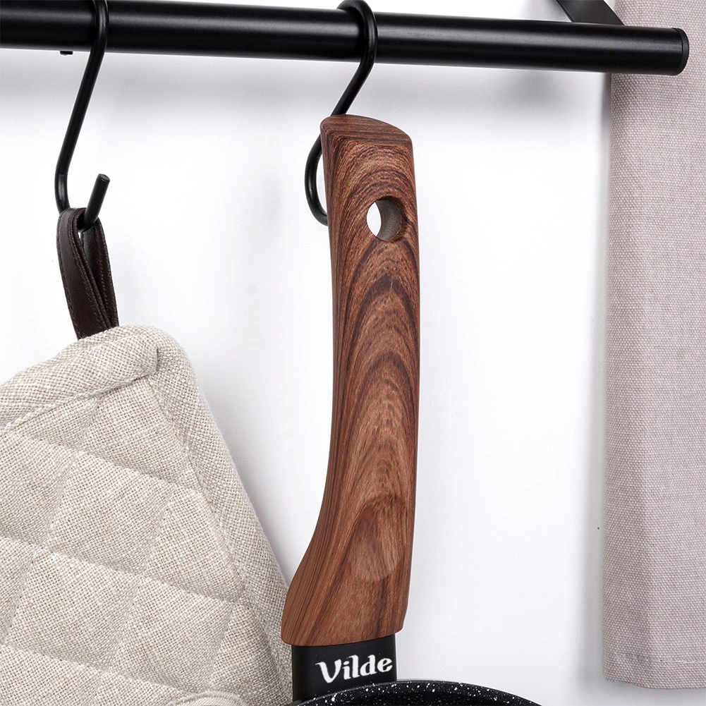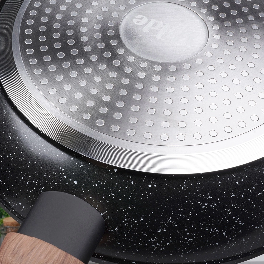 Dzięki aluminiowemu rdzeniowi ciepło szybko i równomiernie rozprowadza się po całej powierzchni — oszczędzasz czas i energię. Patelnie są kompatybilne z kuchenkami gazowymi, elektrycznymi, ceramicznymi, halogenowymi i indukcyjnymi. Ergonomiczne, antypoślizgowe uchwyty z drewnianym dekorem świetnie leżą w dłoni i mają otwór do praktycznego zawieszenia.