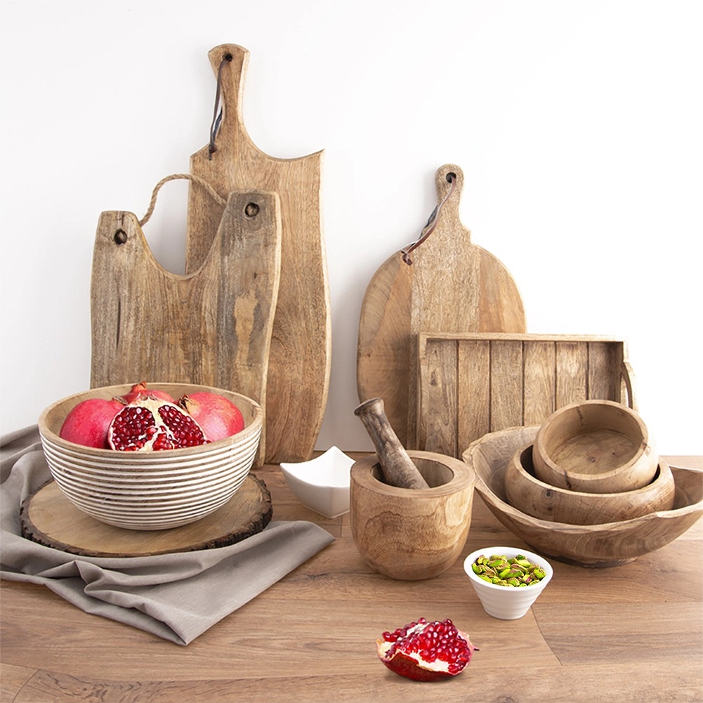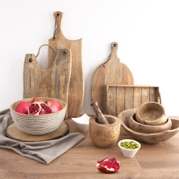 - Wytrzymałe drewno mango: nie odkształca się, nie pochłania zapachów, szybko schnie.