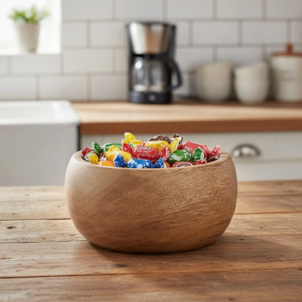 Ta miska z egzotycznego drewna mango zachwyca naturalnym rysunkiem słojów i solidnym wykonaniem. Idealna do codziennego użytku – od orzechów i suszonych owoców po sałatki czy dodatki. Dzięki odporności drewna na wilgoć doskonale nadaje się do serwowania zarówno ciepłych, jak i zimnych potraw.