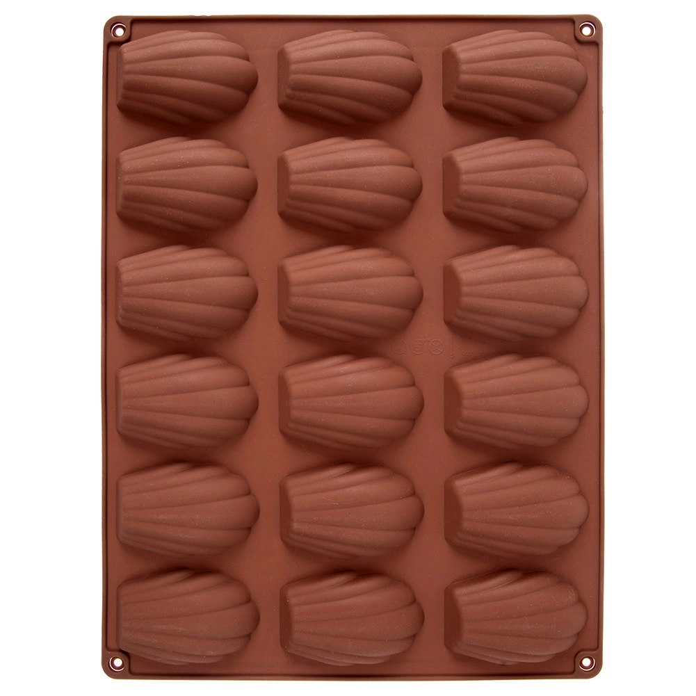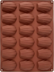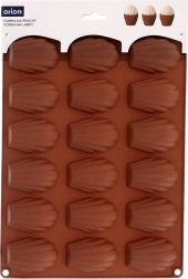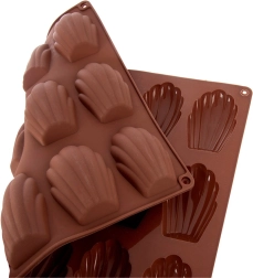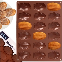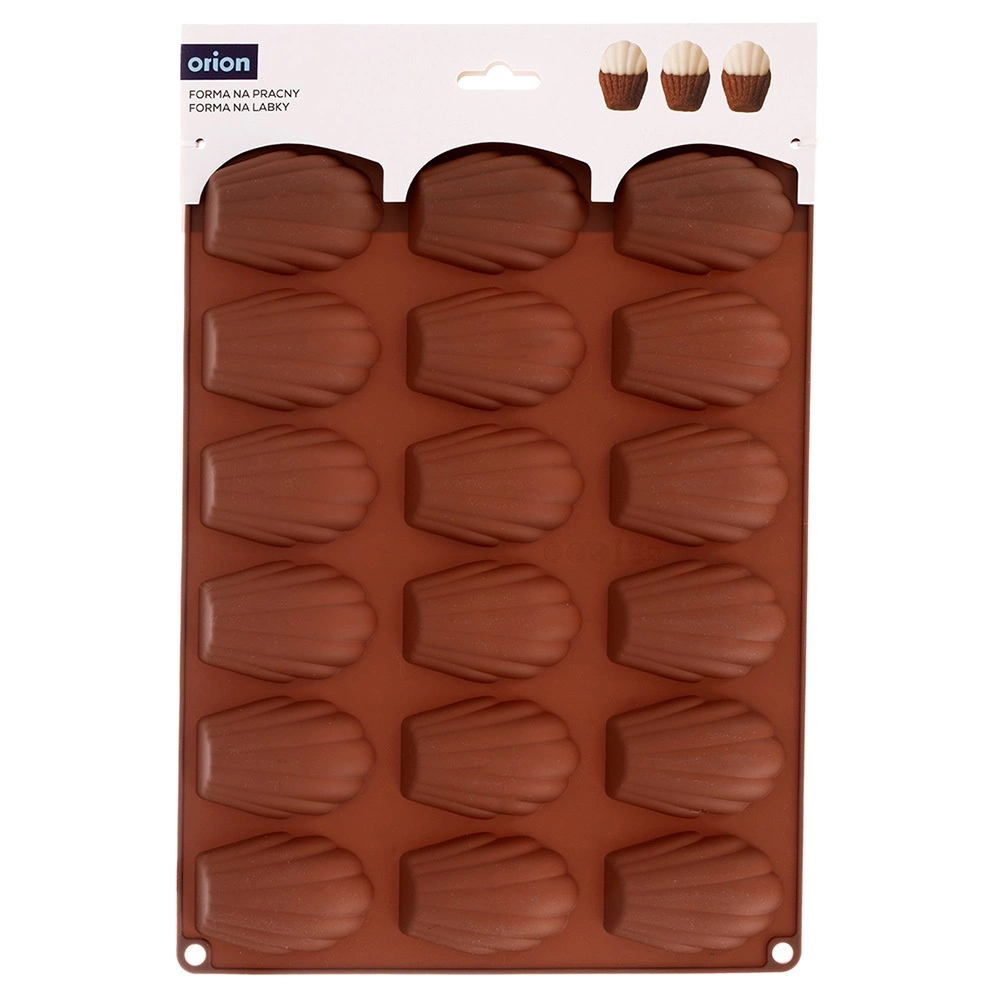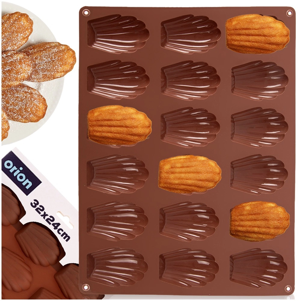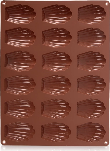 Ta brązowa silikonowa forma jest idealna do domowego pieczenia madeleine, mini babeczek oraz do przygotowywania pralinek i czekoladek w kształcie muszli. Wymiary formy 32 × 24,5 × 2 cm mieszczą 18 zagłębień, każde o wielkości około 7 × 4,5 cm. Nie pochłania zapachów ani smaków, świetnie przewodzi ciepło, a dzięki elastyczności desery łatwo wyjąć bez konieczności natłuszczania.