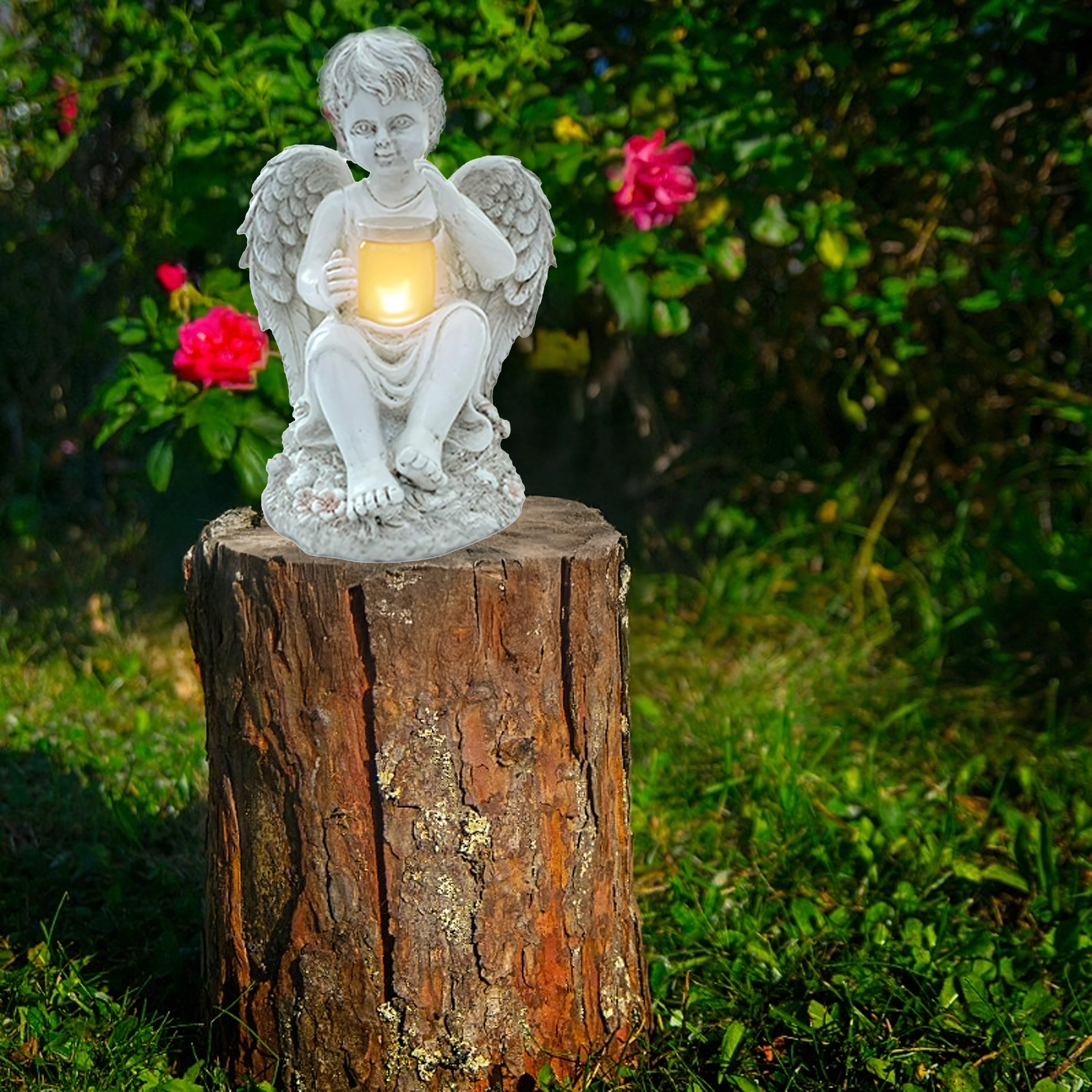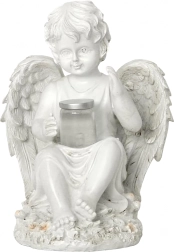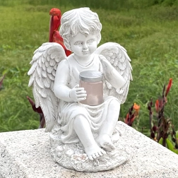 Delikatne, ciepłe światło w naczynku trzymanym przez anioła tworzy kojącą, wieczorną atmosferę w ogrodzie lub przy pomniku.