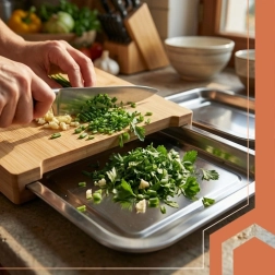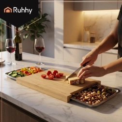 Odkryj sprytną deskę kuchenną, która przyspiesza krojenie i sprzątanie. Dwa wysuwane pojemniki zbierają pokrojone składniki lub odpadki, dzięki czemu pracujesz czysto i efektywnie. Bambusowa płyta jest mocna, odporna na wilgoć, a jednocześnie delikatna dla noży.