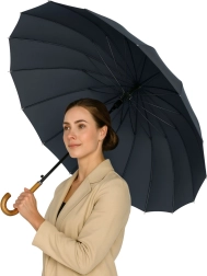 Elegancki i wyjątkowo wytrzymały długi parasol z 24 wzmocnionymi żebrami łączy klasyczny styl, wysoką stabilność na wietrze oraz wygodę automatycznego otwierania. Duża czasza 115 cm niezawodnie chroni zarówno jedną osobę, jak i parę, wodoodporna i szybkoschnąca tkanina ułatwia pielęgnację, a drewniana zakrzywiona rączka nadaje ponadczasowy wygląd. W zestawie pokrowiec z paskiem na ramię dla wygodnego noszenia.