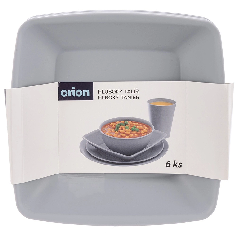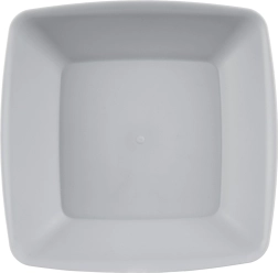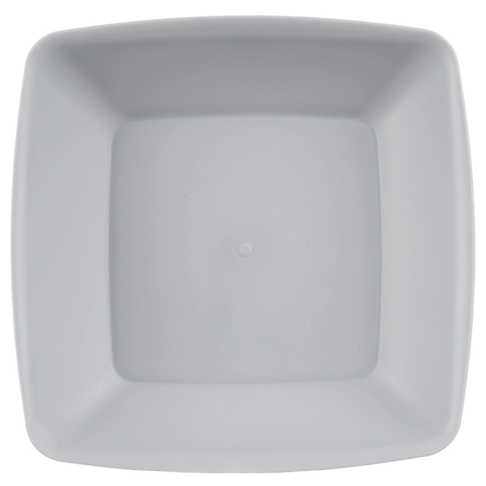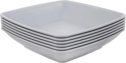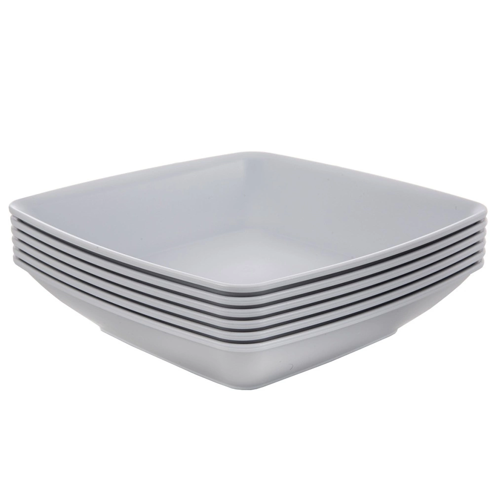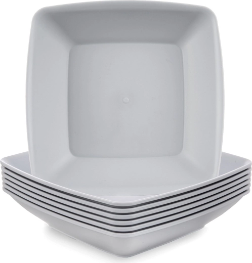 Lekki i wytrzymały zestaw sześciu głębokich talerzy w nowoczesnym kwadratowym kształcie jest idealny do codziennego użytku i na kemping. Oferuje pojemność 500 ml, wymiary 17,5 × 17,5 × 4,7 cm oraz łatwe sztaplowanie. Odpowiednie do mikrofalówki i zmywarki, wykonane z mocnego plastiku w eleganckim szarym kolorze.