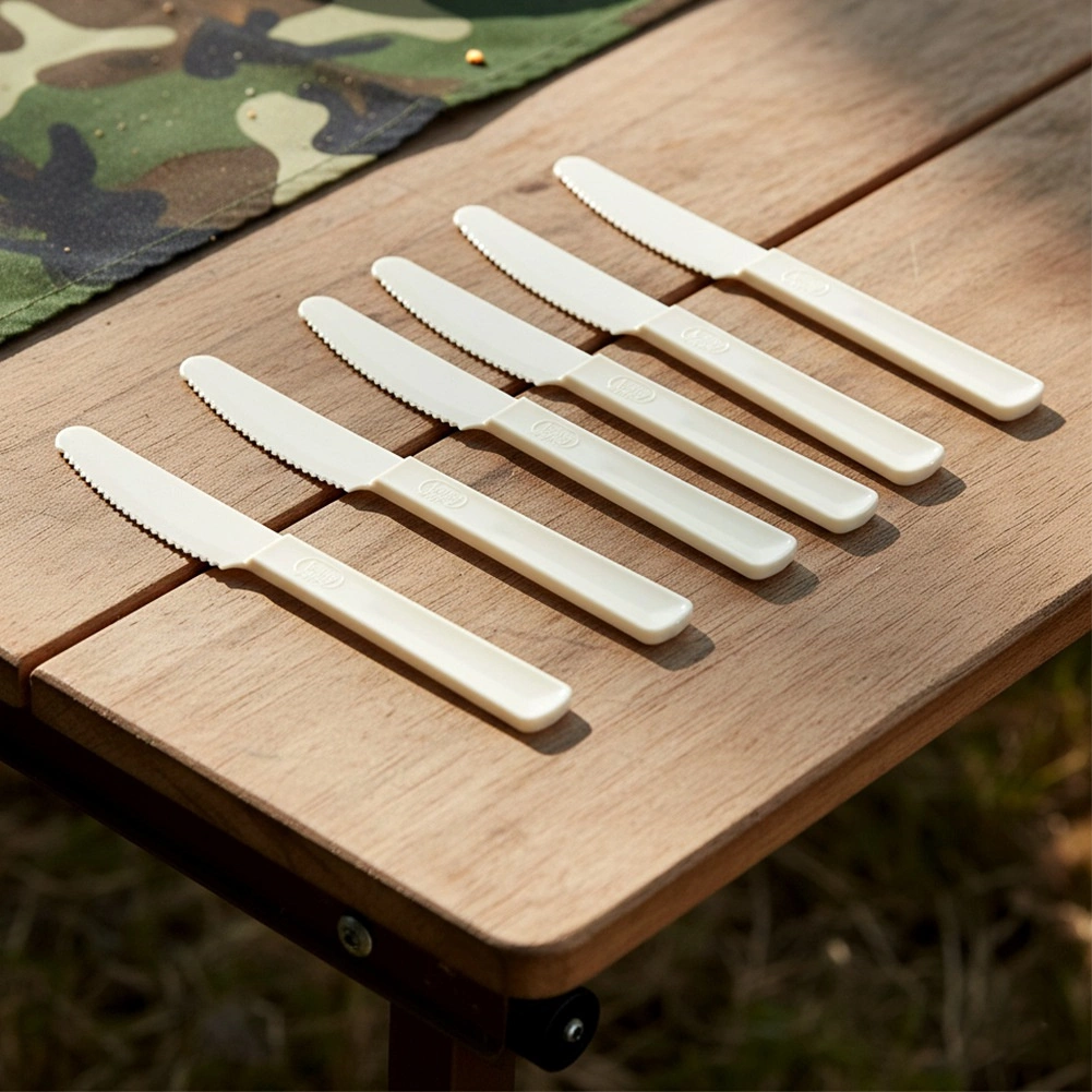 Zestaw 6 plastikowych noży SANDY jest idealny do codziennego użytku oraz na pikniki, kemping i ogrodowe spotkania. Noże są lekkie, ale mocne i odporne na pękanie i deformacje. Bezpiecznie kroją miększe produkty, takie jak pieczywo, ciasta, owoce i warzywa.