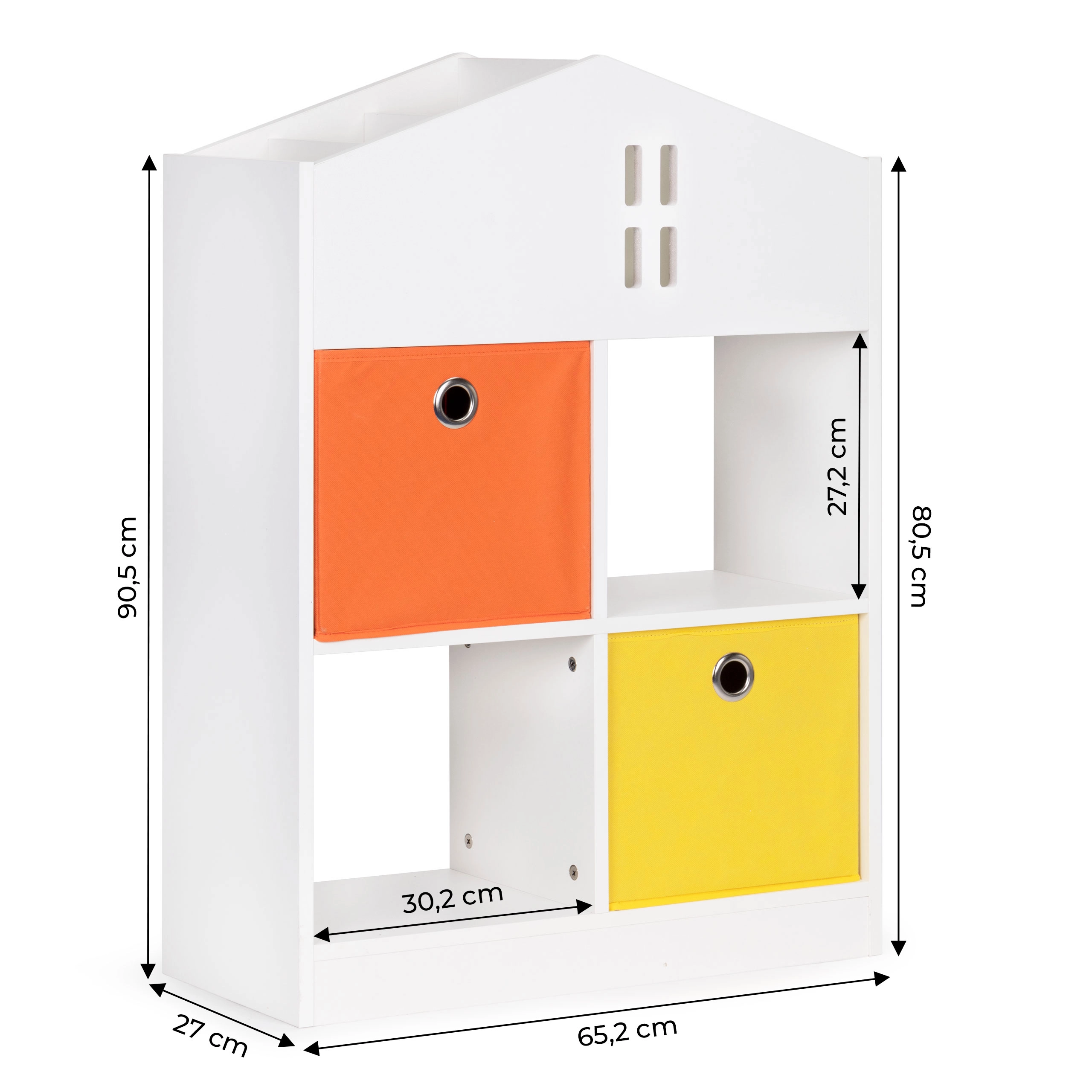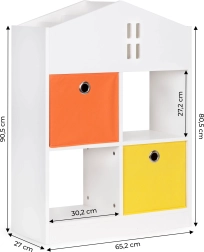 Ta dziecięca biblioteczka w kształcie domku jest idealna do przechowywania książek, zabawek i drobiazgów, które Twoje dziecko chce mieć pod ręką. Dzięki czterem pojemnym półkom, praktycznym przegrodom oraz 2 materiałowym koszom łatwo stworzysz przejrzysty system organizacji. Śnieżnobiały kolor pasuje do każdego wnętrza – do pokoju dziecięcego, sali zabaw czy poczekalni.
