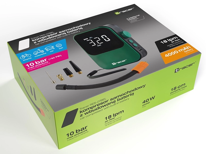 Szukasz niezawodnego kompresora w trasę? Kompresor TRACER łączy wysoką wydajność, proste sterowanie i praktyczne funkcje w jednym kompaktowym urządzeniu. Dzięki maks. ciśnieniu 10 bar i przepływowi 18 l/min szybko dopompujesz opony samochodu lub roweru, sprzęt sportowy i akcesoria dmuchane.