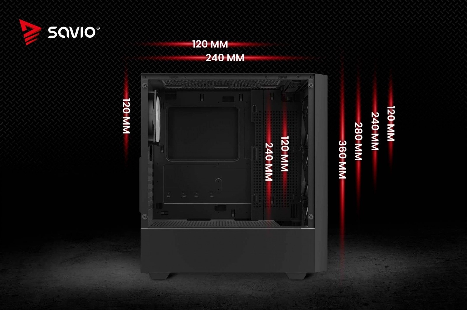- Góra: 120/240 mm; Przód: 120/240/280/360 mm; Przy płycie: 120/240 mm; Tył: 120 mm