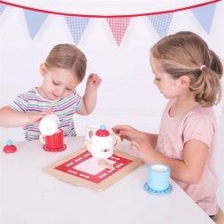 Wszystko, czego dzieci potrzebują do goszczenia: dzbanek, filiżanki ze spodeczkami, cukiernica, dzbanuszek na mleko, łyżeczki oraz stabilna taca ułatwiająca serwowanie.