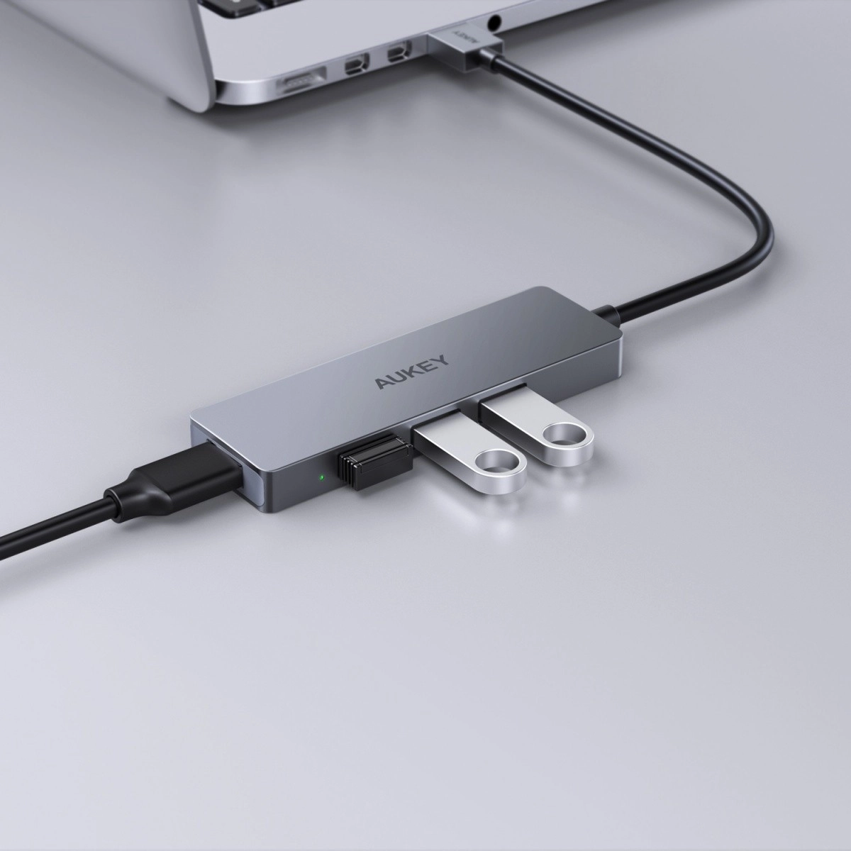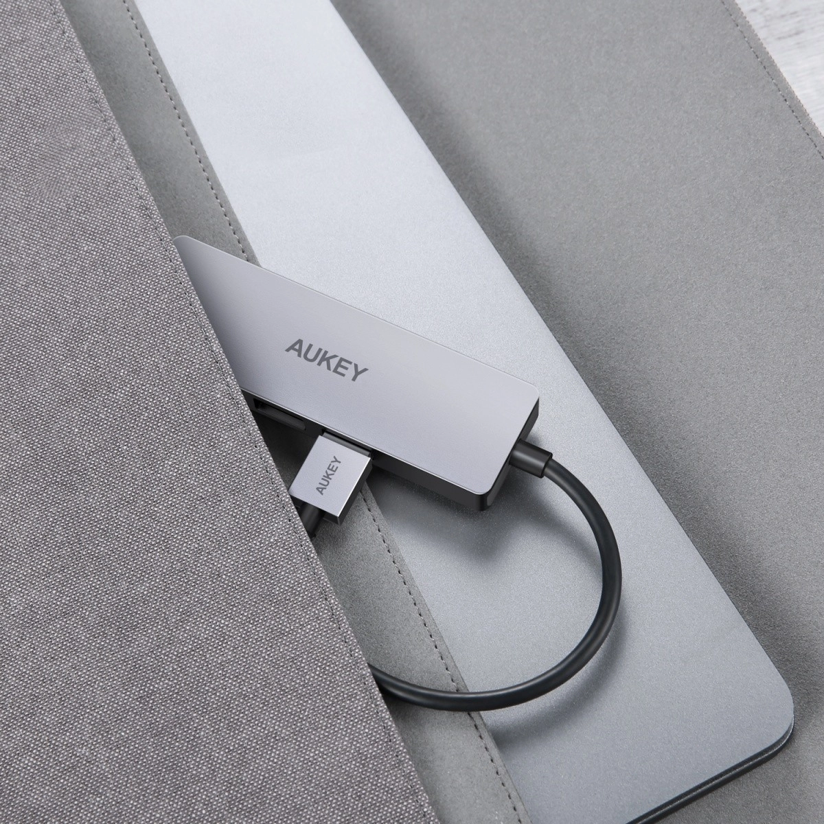 Stylowy i kompaktowy hub USB AUKEY zamienia jeden port USB-A w cztery superszybkie porty do wygodnego podłączenia klawiatury, myszy, pendrive’ów, dysków zewnętrznych i innych peryferiów. Dzięki interfejsowi USB 3.0 osiąga prędkości transferu do 5 Gb/s, więc tworzenie kopii zdjęć, praca z dużymi plikami oraz przesył wideo zajmują zaledwie kilka sekund.
