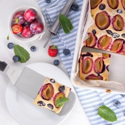 Dzięki naostrzonym krawędziom łatwo podzielisz na porcje i przeniesiesz gotowe potrawy bezpośrednio z patelni lub blachy. Materiały są odporne na wysoką temperaturę i odpowiednie do codziennego gotowania. Pielęgnacja jest prosta – łopatkę można myć w zmywarce.