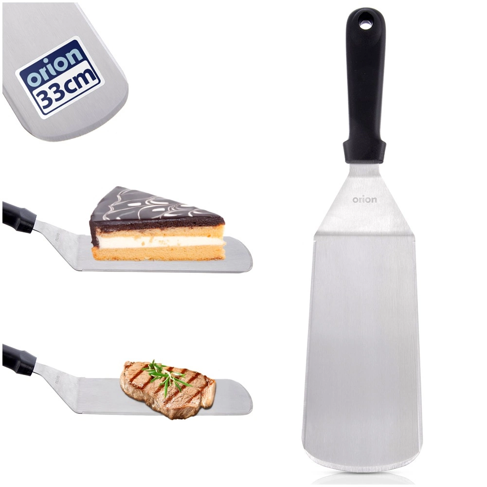 Praktyczna kuchenna łopatka ze stali nierdzewnej do łatwego nabierania i przewracania potraw. Ma szerokie ostrze z naostrzonymi krawędziami do porcjowania i krojenia, ergonomiczną rękojeść dla pewnego chwytu i jest odpowiednia do zmywarki. Idealna do ryb, naleśników, lasagne, placków, mięsa, pizzy i omletów.