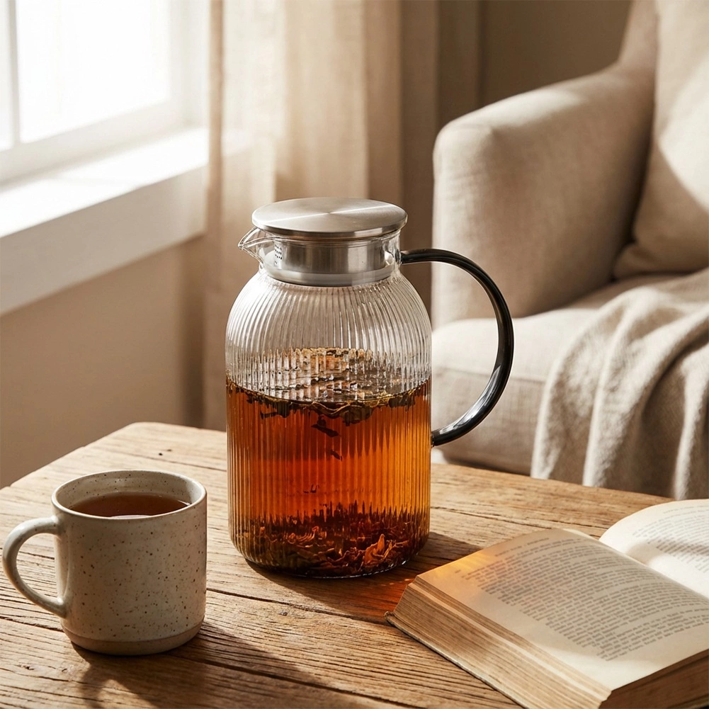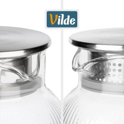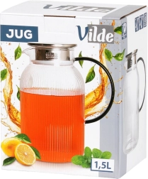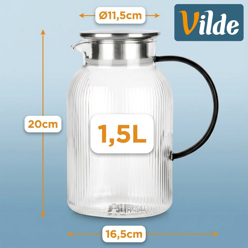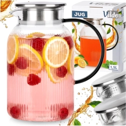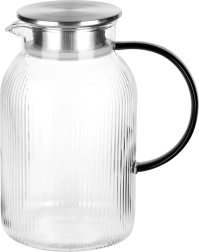 Elegancki szklany dzbanek o pojemności 1,5 l z pokrywką ze stali nierdzewnej i podwójnym systemem nalewania (pełny otwór i sitko). Wykonany z szkła borokrzemowego z dekoracyjnym żłobkowaniem dla lepszego chwytu, odporny na temperatury od -20 °C do 150 °C. Praktyczny czarny uchwyt, łatwe czyszczenie i możliwość mycia w zmywarce.