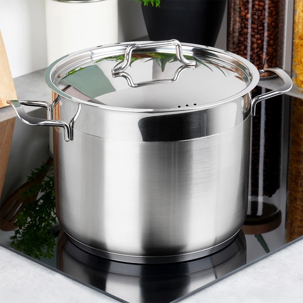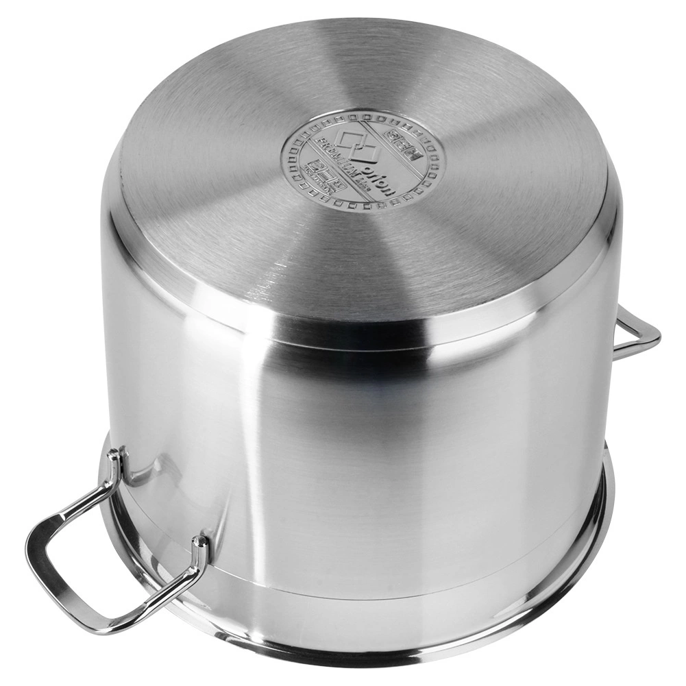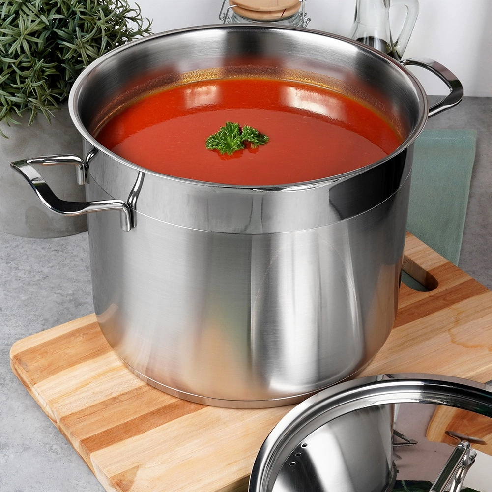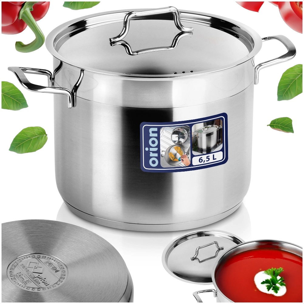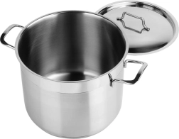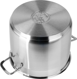 Wysokiej jakości garnek ze stali nierdzewnej z pokrywką o pojemności 6,5 l idealnie nadaje się do codziennego gotowania i duszenia. Dzięki wielowarstwowemu dnu akutermicznemu doskonale akumuluje i równomiernie rozprowadza ciepło, nadaje się na wszystkie typy kuchenek, w tym indukcję i umożliwia energooszczędne gotowanie z minimalną ilością tłuszczu. Wysokiej klasy stal nierdzewna 18/10, masywne ścianki, wygodne uchwyty oraz łatwe czyszczenie także w zmywarce czynią z garnka niezawodnego pomocnika w każdej kuchni.
