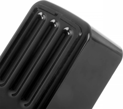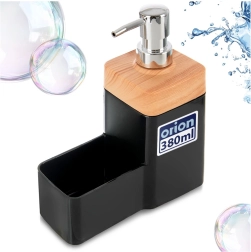 Ten dozownik do płynu do mycia naczyń z boczną przegródką na gąbkę lub szczotkę utrzymuje wszystkie akcesoria pod ręką i blat w czystości. Eleganckie połączenie czarnego korpusu, chromowanej pompki oraz dekoru drewna świetnie współgra z nowoczesnym, klasycznym i industrialnym stylem kuchni.
