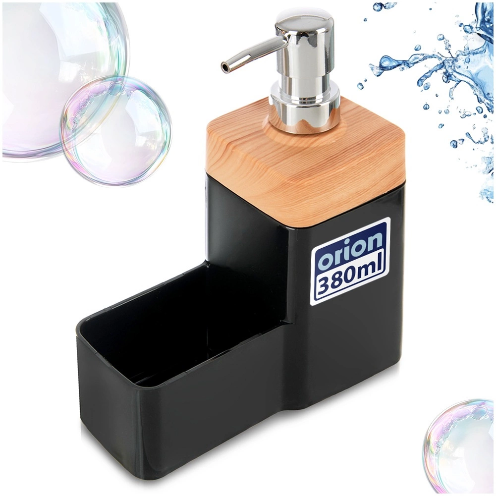 Praktyczny dozownik do płynu do mycia naczyń z wbudowanym organizerem na gąbkę utrzymuje porządek przy zlewie. Łączy nowoczesne czarne wykończenie z dekorem drewna, ma pojemność 500 ml oraz antypoślizgową podkładkę dla stabilności. Łatwe uzupełnianie i elegancki wygląd pasują do każdej kuchni.