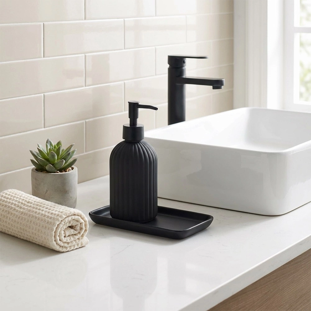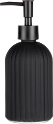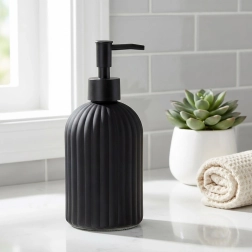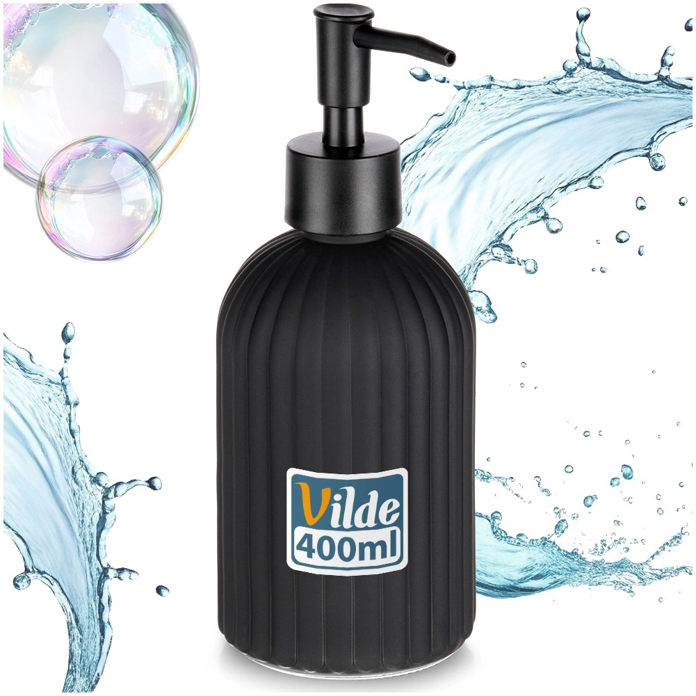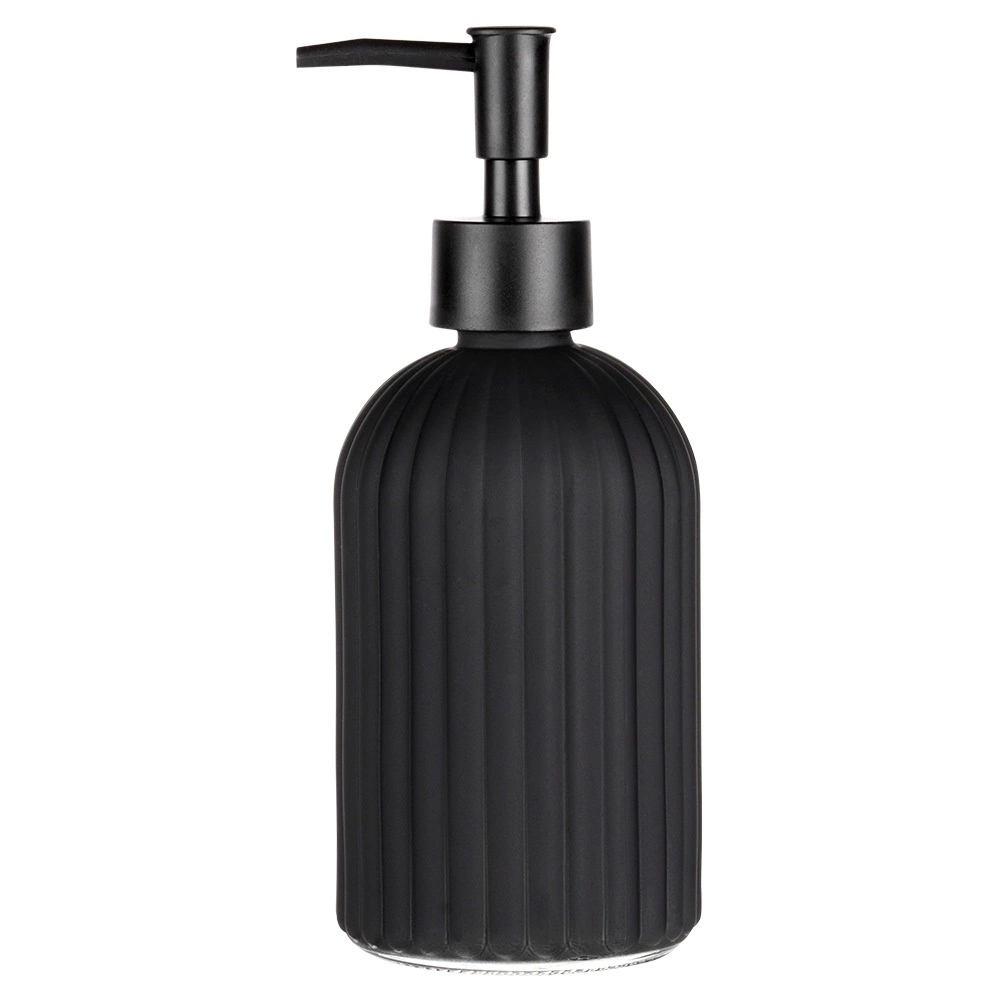 Elegancki szklany dozownik do mydła w płynie lub płynu do naczyń o pojemności 400 ml w matowej czerni. Dzięki rowkowanej powierzchni doskonale leży w dłoni, nowoczesny design pasuje do łazienki i kuchni, a łatwe uzupełnianie oszczędza czas i pieniądze.
