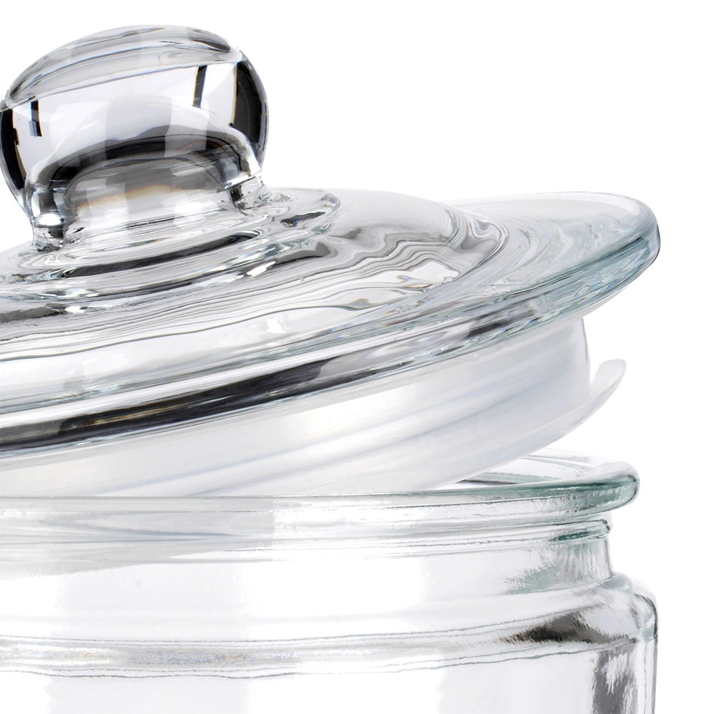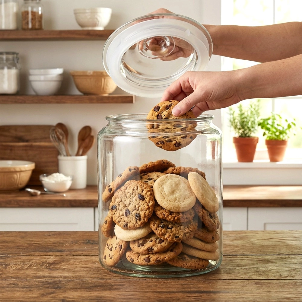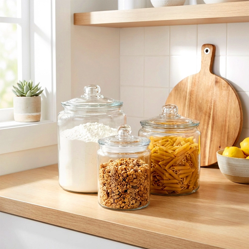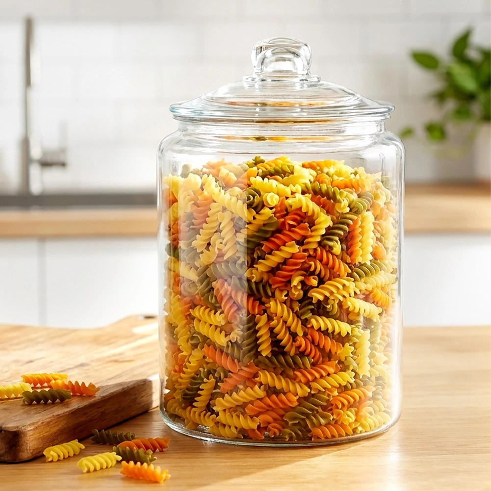 Wytrzymałe, klarowne szkło umożliwia natychmiastową kontrolę zapasów i estetycznie eksponuje makarony, mąkę czy ciasteczka na kuchennym blacie.