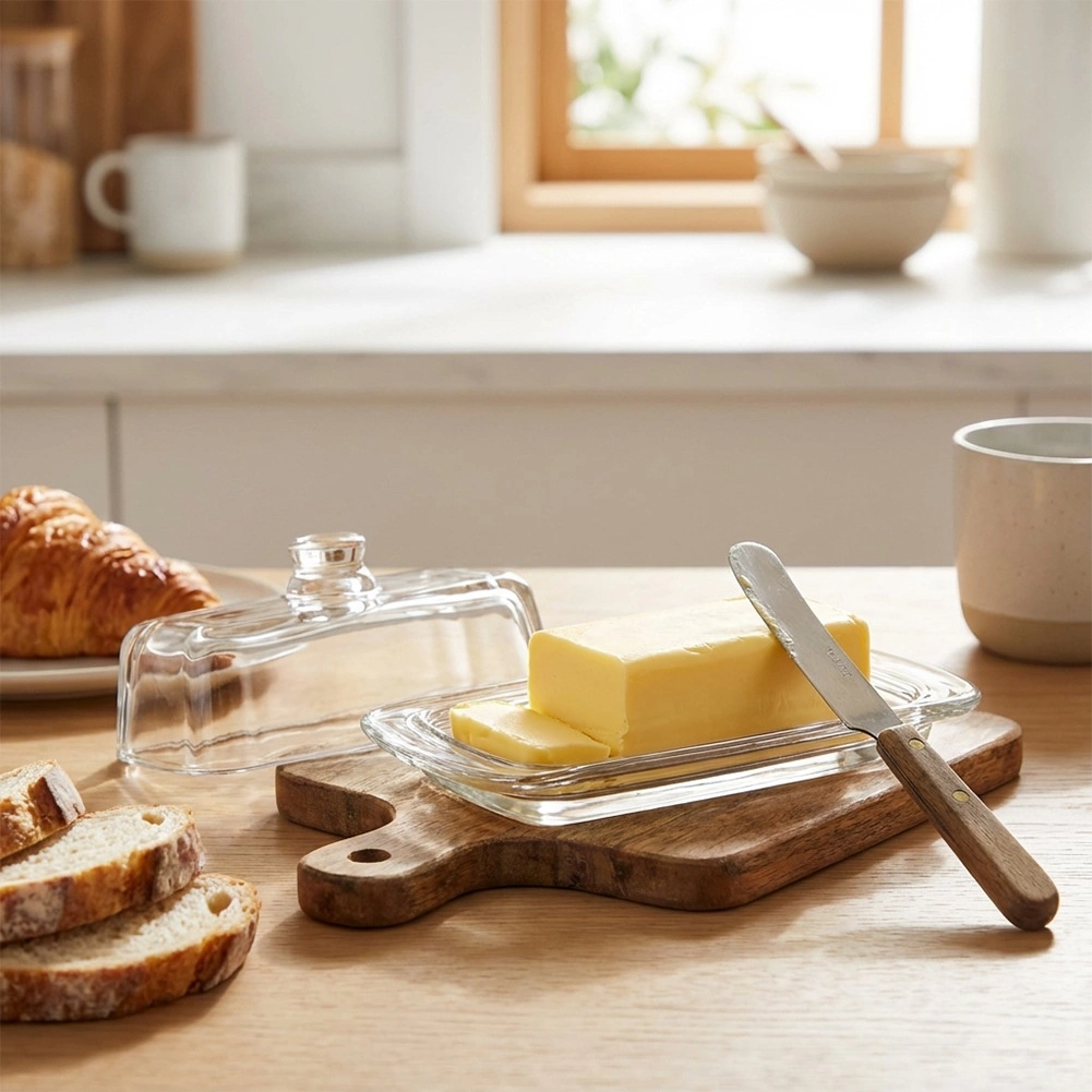 Maselniczka świetnie prezentuje się podczas śniadania i kolacji – design pasuje do każdego zestawu naczyń i nadaje stołowi czysty, nowoczesny wygląd.