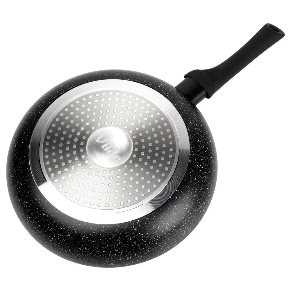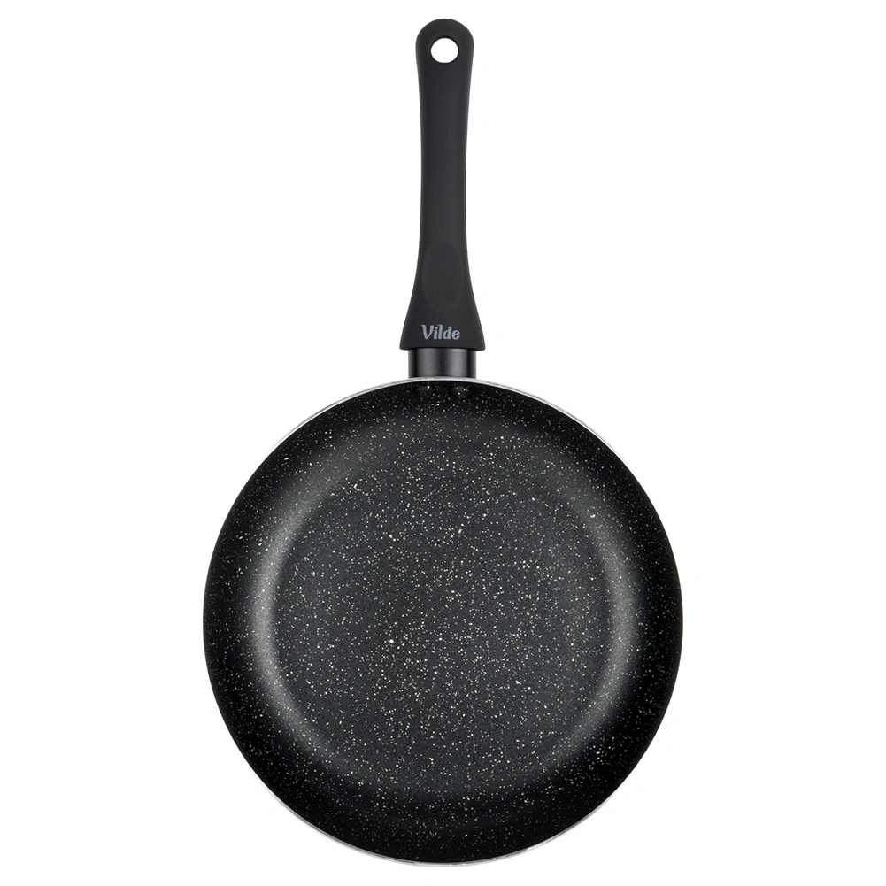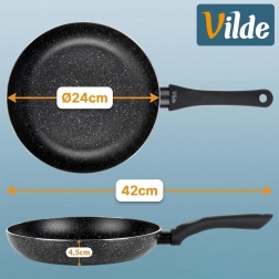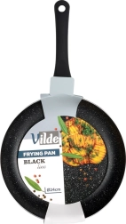 Ta granitowa patelnia Vilde z linii Black Line łączy nowoczesny wygląd i praktyczne funkcje. Wytrzymały aluminiowy odlew z nieprzywierającą warstwą granitową zapewnia łatwe odchodzenie potraw i szybkie czyszczenie. Elegancja czarnego, kamiennego dekoru doskonale uzupełni każdą kuchnię.