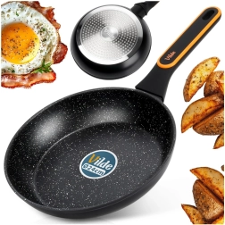 - Nieprzywierająca granitowa powłoka – łatwe przewracanie i mycie, mniej tłuszczu, zdrowsze gotowanie.