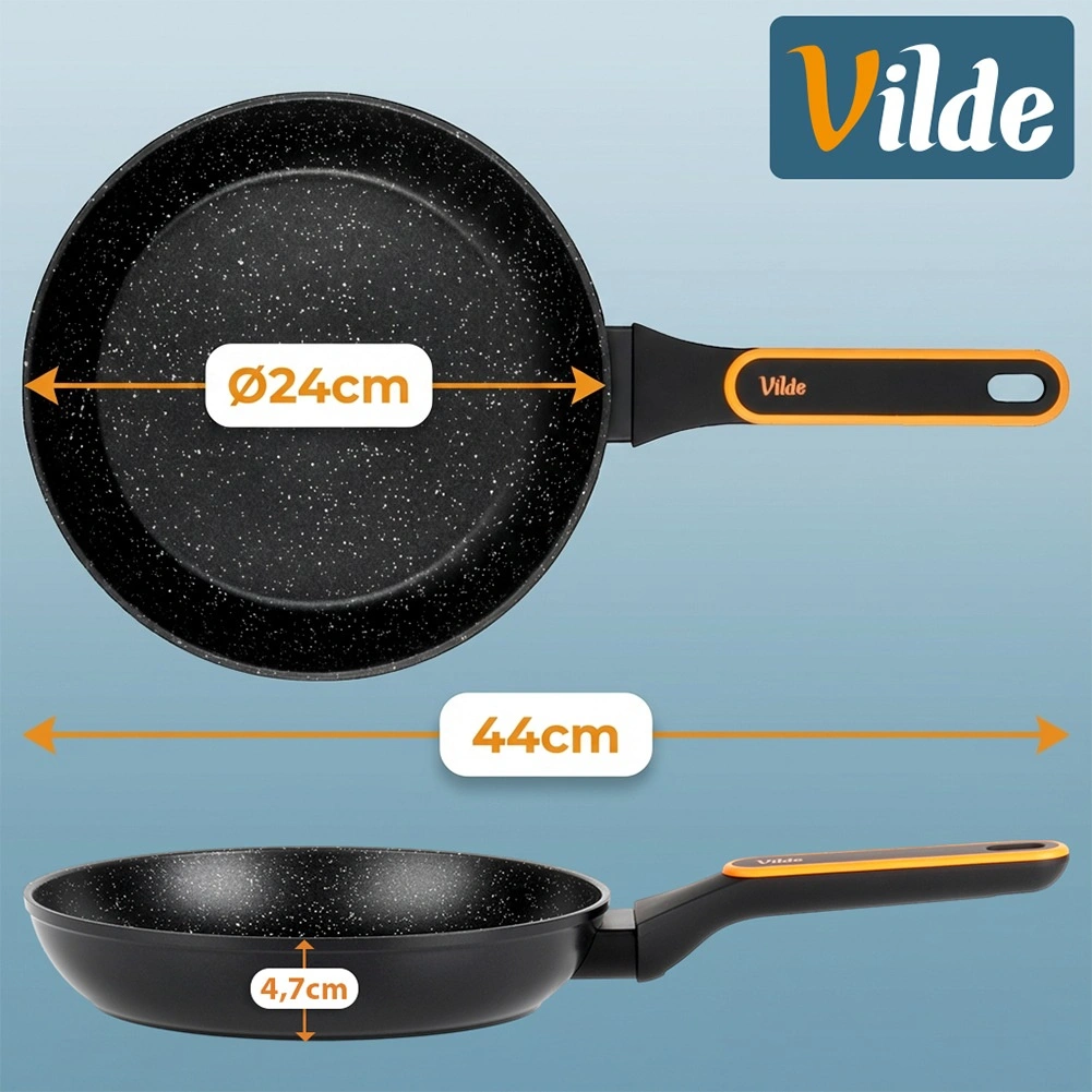 - Długość z uchwytem 44 cm; wysokość patelni 4,7 cm; wysokość z uchwytem 7 cm