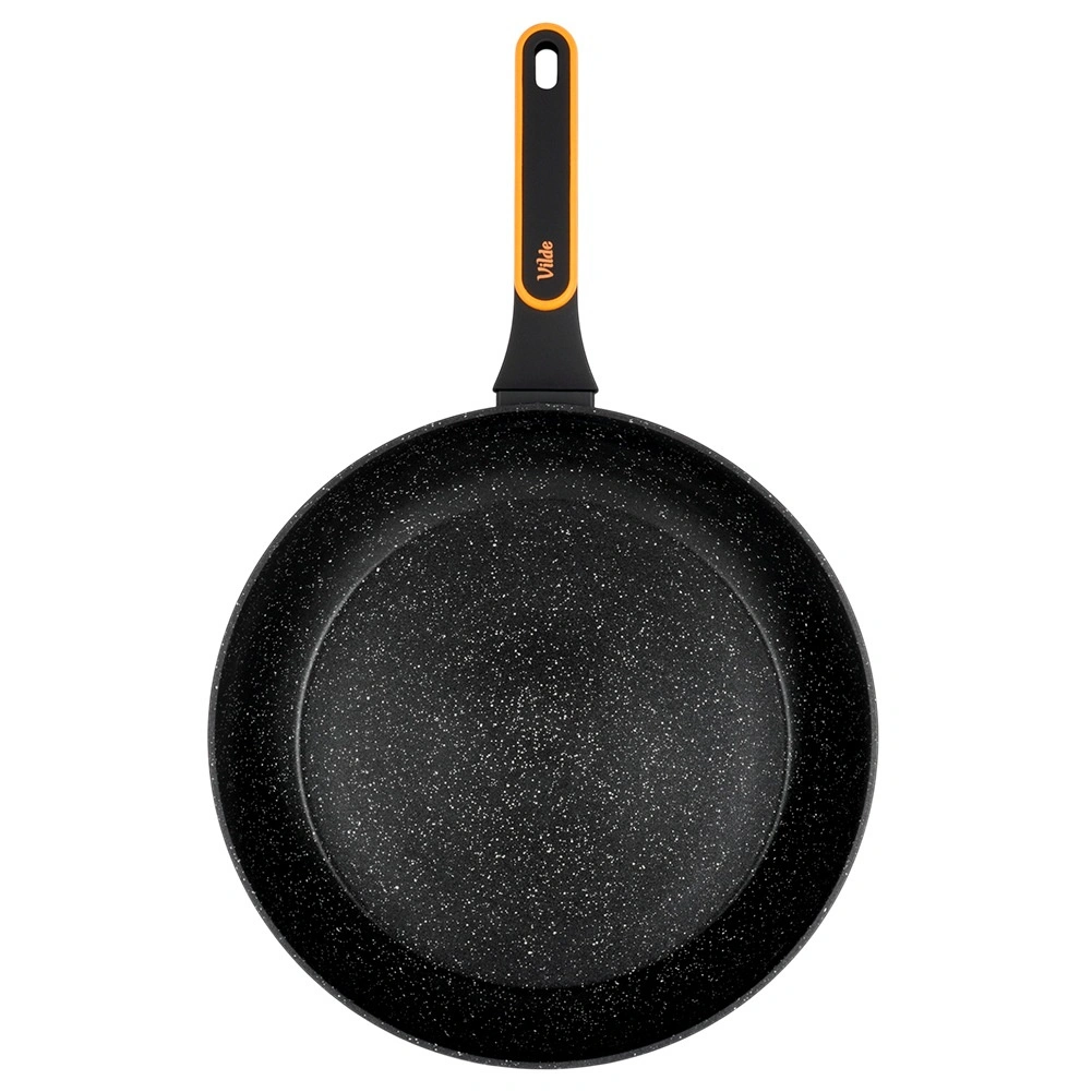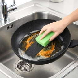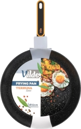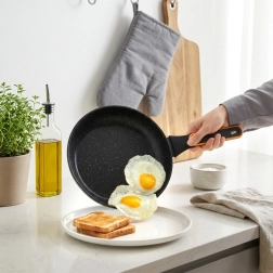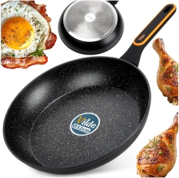 Powierzchnia przypominająca kamień minimalizuje przypalanie i umożliwia smażenie z minimalną ilością oleju. Jedzenie łatwo się obraca, a patelnia szybko się czyści.