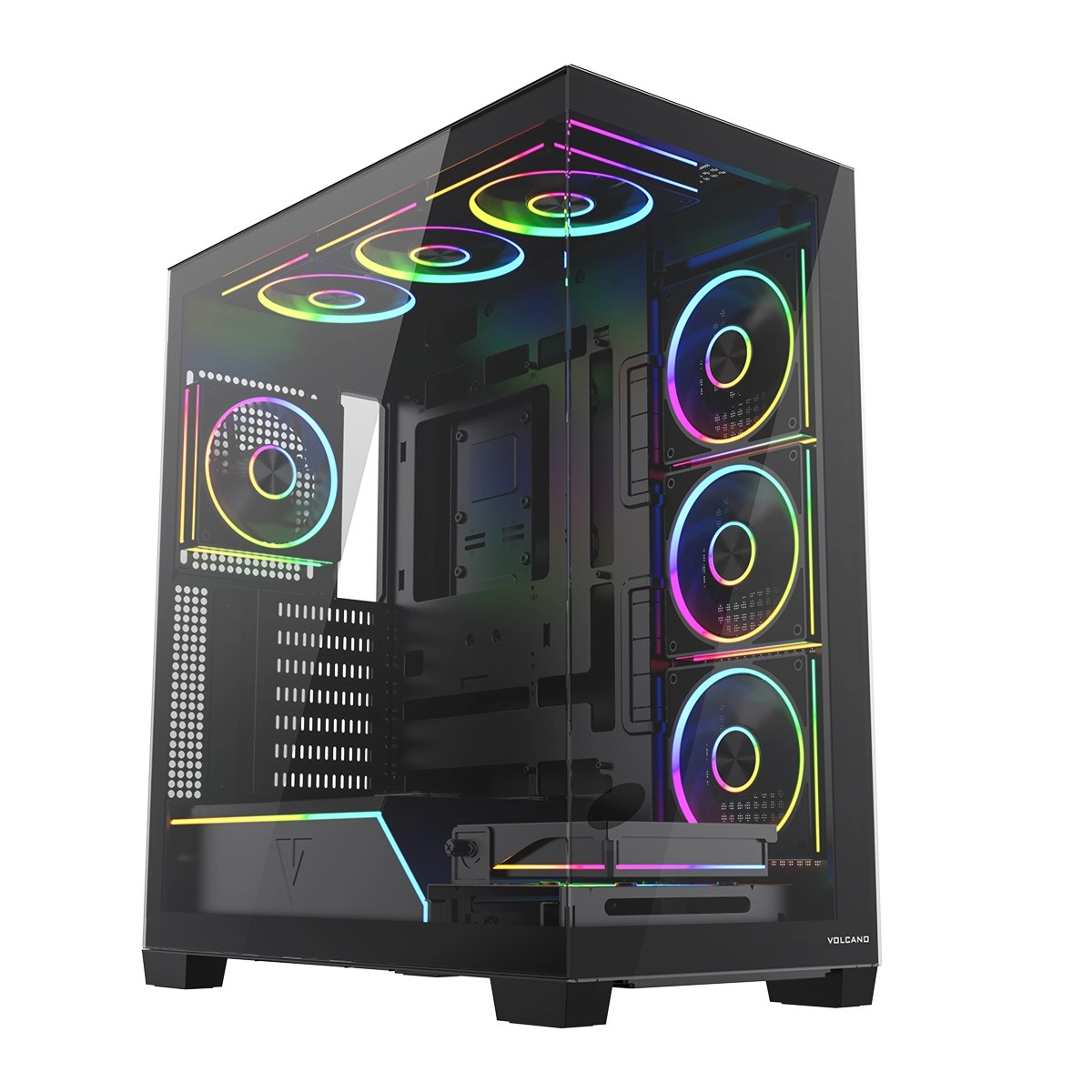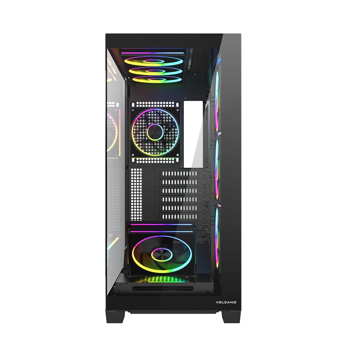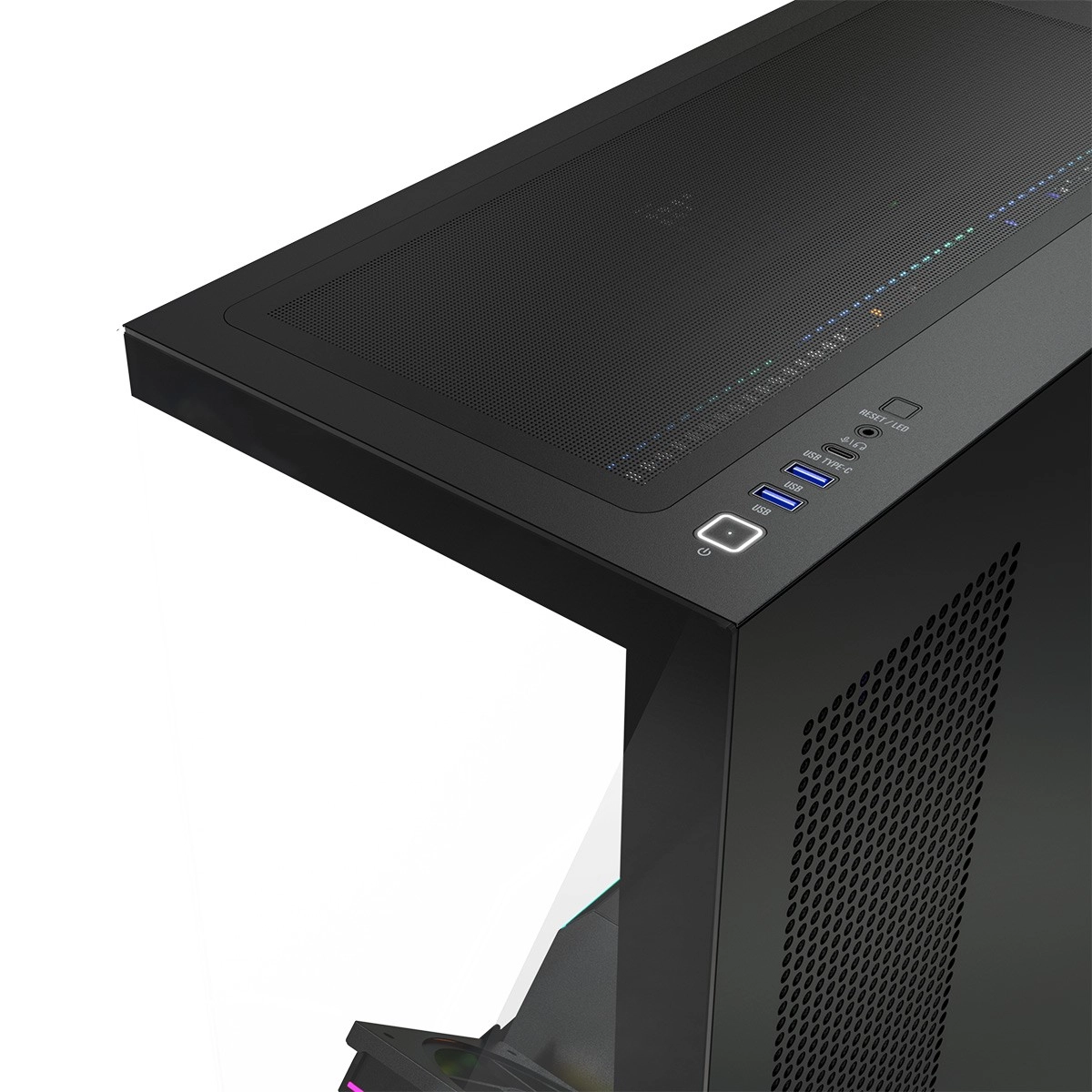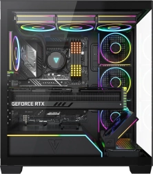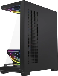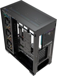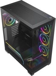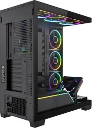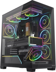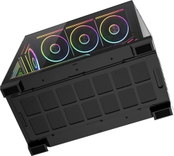 Stylowa obudowa dla graczy i twórców z panoramicznym „akwariowym” designem z hartowanego szkła, ośmioma wentylatorami ARGB PWM i paskiem LED ARGB. Oferuje topowe przepływy powietrza, miejsce na GPU do 420 mm, chłodzenie CPU do 175 mm, wsparcie chłodzenia wodnego do 360 mm oraz kompatybilność z płytami z odwróconymi złączami (BTF). Praktyczne boczny panel na szybkozatrzask bez śrub, filtry przeciwkurzowe i USB‑C na panelu I/O podkreślają funkcjonalność i design.