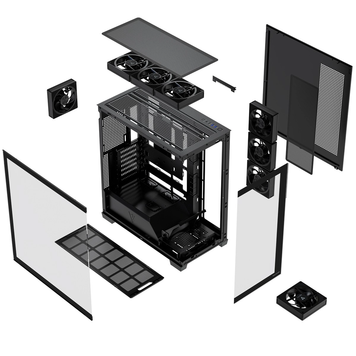 Przedni i boczny panel z hartowanego szkła podkreśla wygląd zestawu. Boczny panel na szybkozatrzask ułatwia montaż i konserwację bez użycia narzędzi.