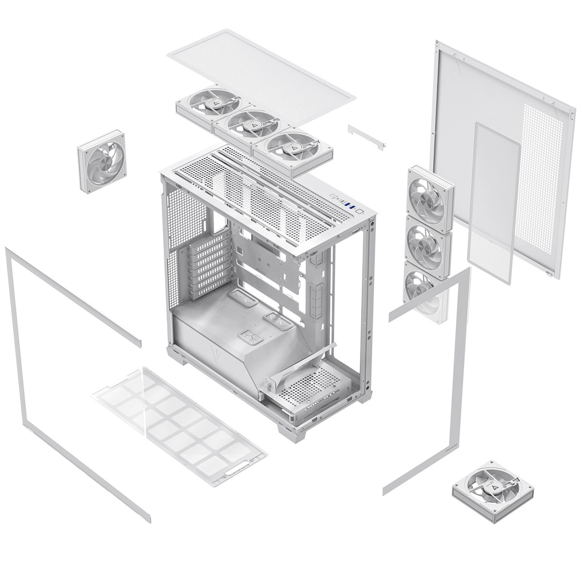 Fabrycznie zamontowane 8× 120 mm ARGB (w tym 3 z odwróconymi łopatkami) oraz ramka kierująca powietrze bezpośrednio na GPU. Stabilne temperatury nawet podczas długiej rozgrywki.