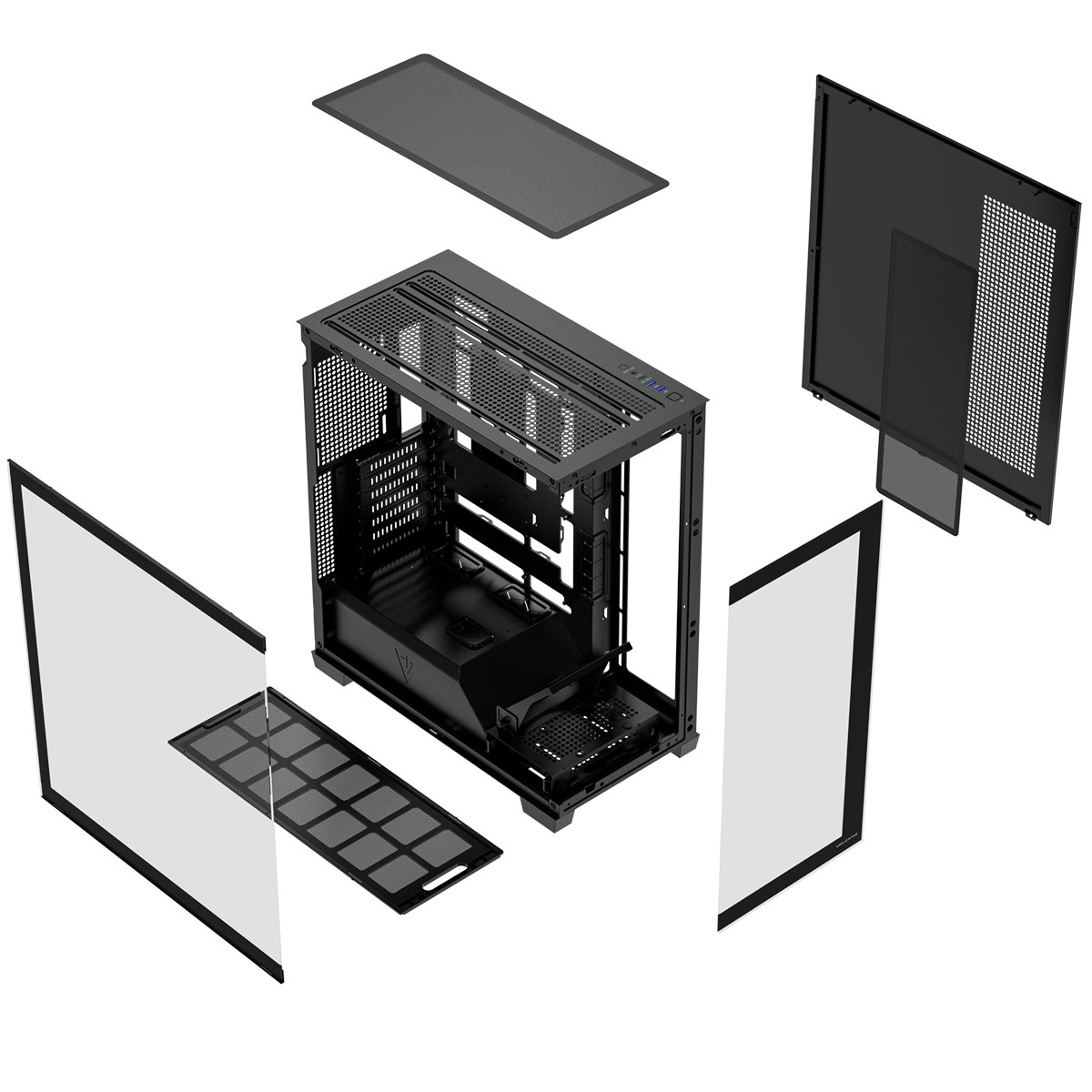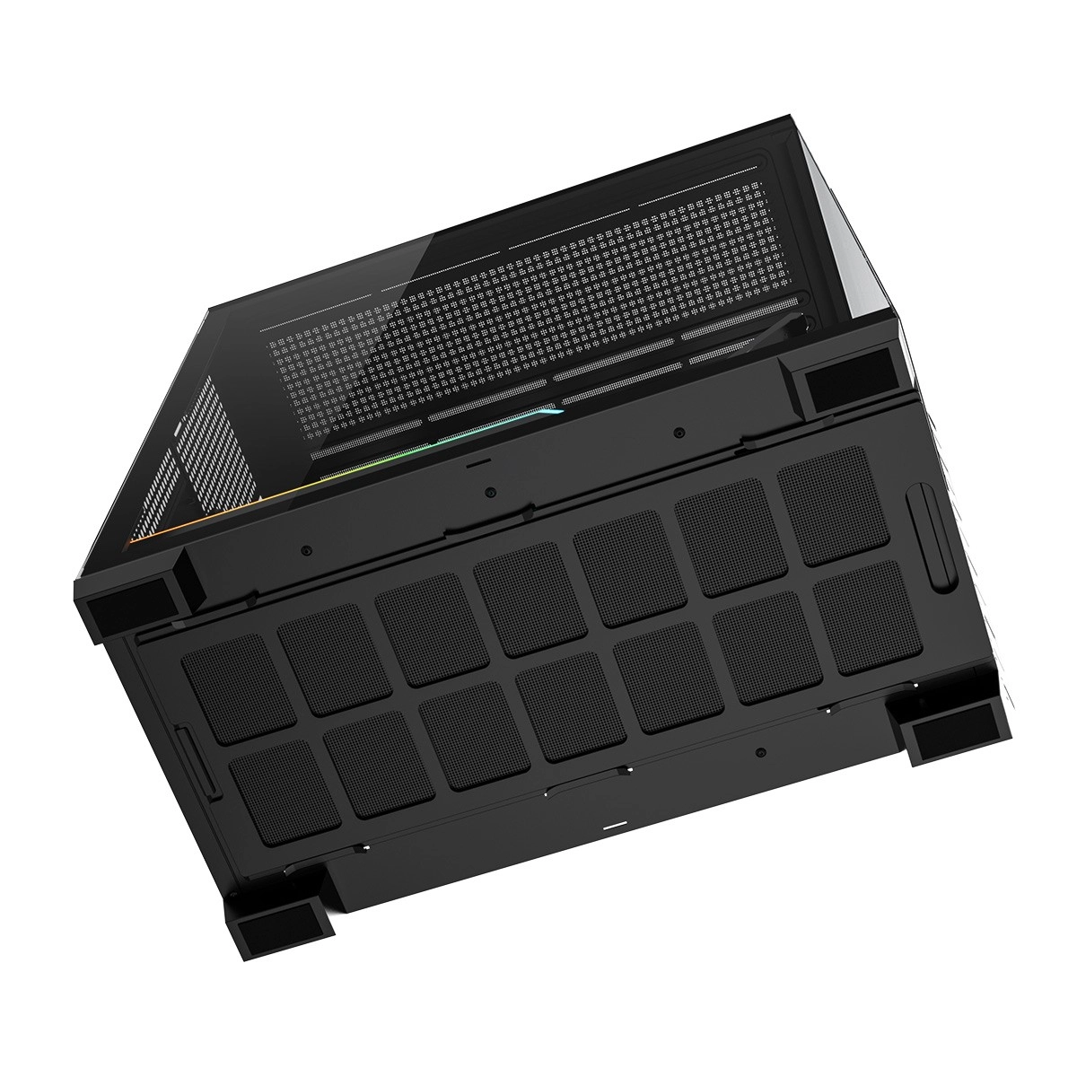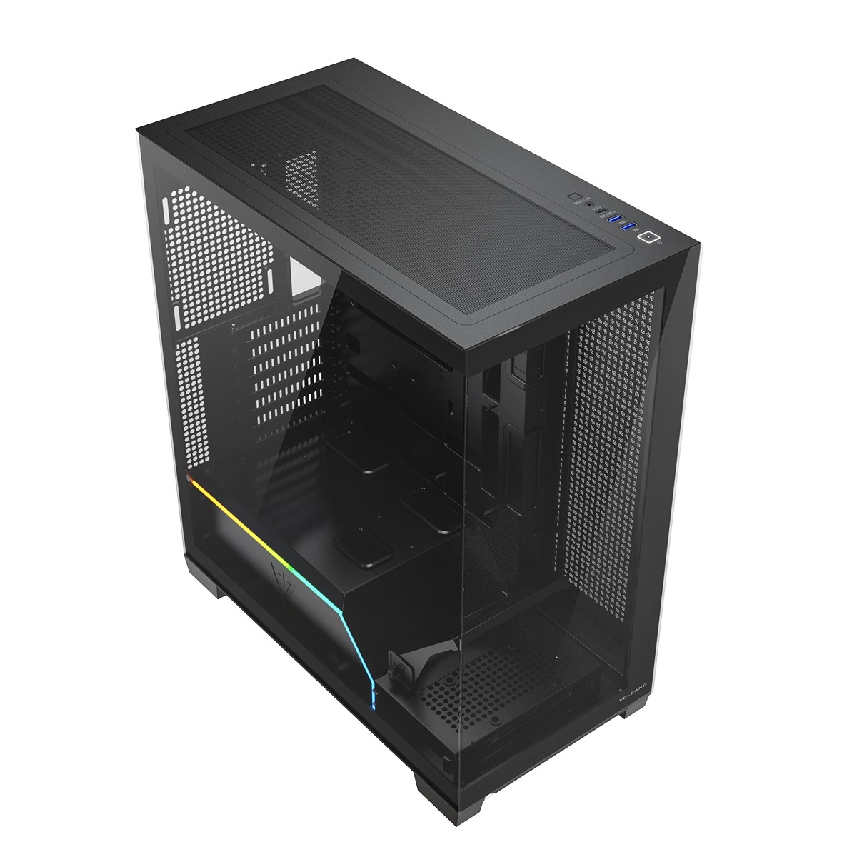 Dla pamięci masowej dostępne są maksymalnie 4 miejsca na dyski 2.5"/3.5", gumowe przepusty chronią okablowanie, a solidne blachy o grubości 0,9 mm gwarantują długą żywotność. Pasek ARGB LED na osłonie zasilacza zapewnia efektowne podświetlenie i podkreśla komponenty.