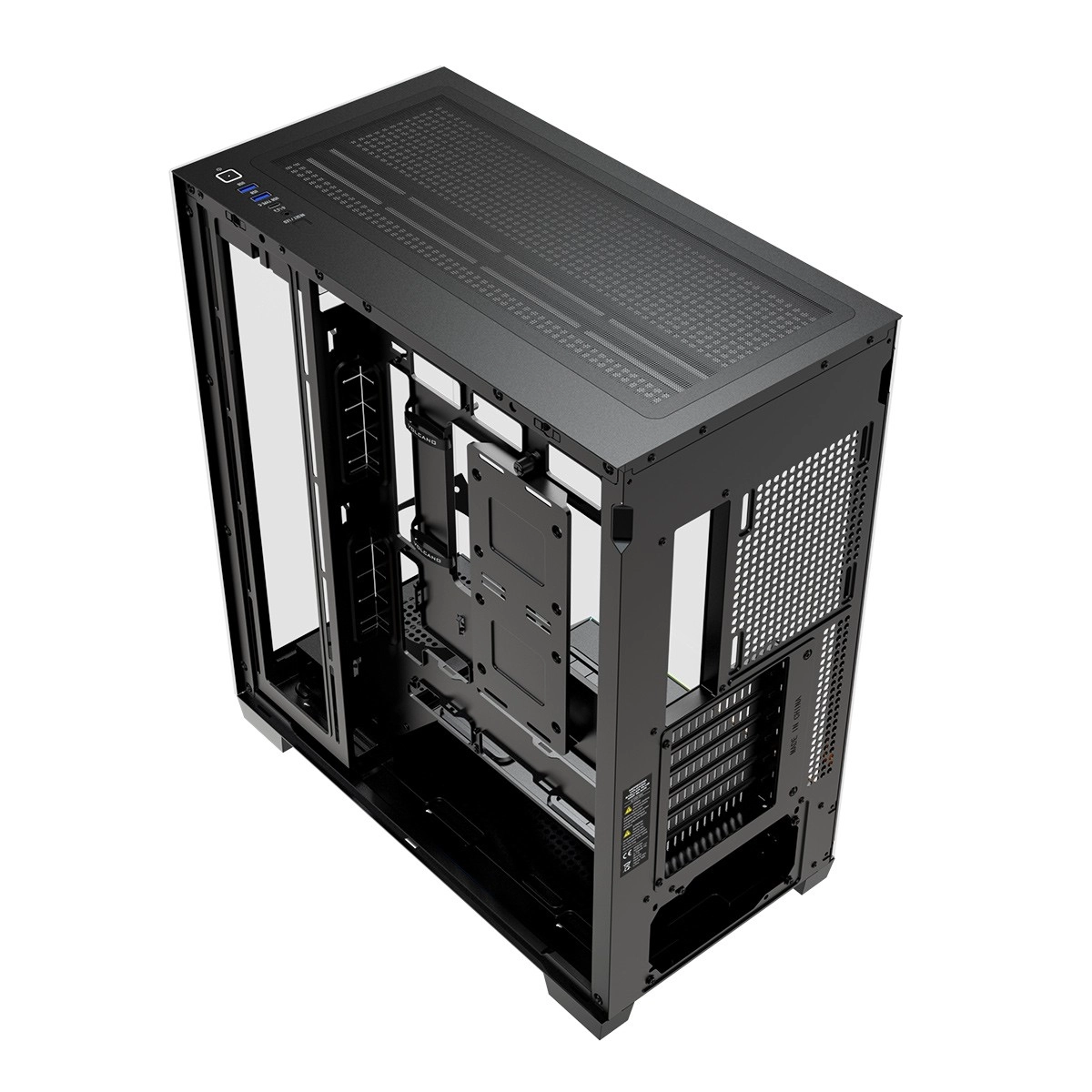 Szkielet wspiera radiatory 360 mm u góry i z boku oraz 120 mm z tyłu, wysokie wieżowe chłodzenia CPU do 175 mm i karty graficzne do 420 mm z możliwością pionowego montażu. Górny panel I/O oferuje USB‑C, 2× USB 3.0 oraz combo audio. Trzy filtry przeciwkurzowe (dolny wysuwany, górny i boczny magnetyczne) upraszczają konserwację i utrzymują wnętrze w czystości.