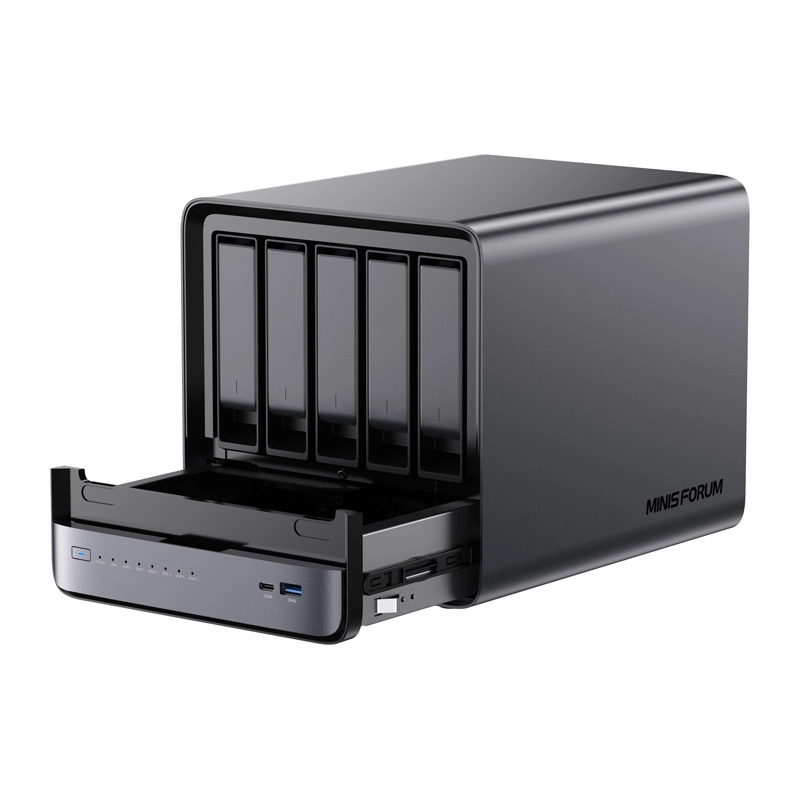 MINISFORUM NAS N5 to wydajne mini PC/NAS do użytku domowego i firmowego. Dzięki procesorowi AMD Ryzen 7 (8C/16T) i zintegrowanej grafice Radeon 780M radzi sobie z multitaskingiem, wirtualizacją, zadaniami AI/ML oraz multimediami 4K/8K. Pamięć masowa do 144 TB w układzie pięciu HDD i trzech NVMe SSD, wsparcie RAID 0/1/5/6 oraz system plików ZFS ze snapshotami zapewniają szybkość i ochronę danych.