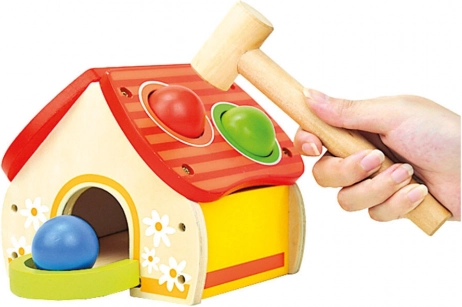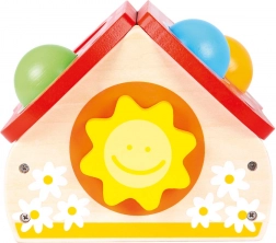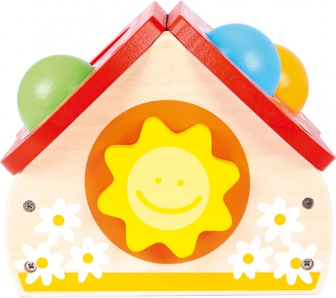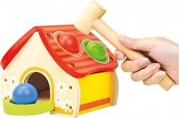 Ta wysokiej jakości drewniana zabawka w formie wesołego domku przyciąga uwagę dzieci wyrazistymi kolorami i prostą zasadą zabawy – piłeczki wkłada się do otworów w dachu i delikatnie wbija młotkiem. Zabawa wspiera rozwój motoryki, cierpliwość oraz precyzję.