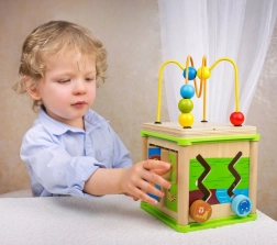 Ta wielofunkcyjna kostka motoryczna łączy pięć ulubionych aktywności: sorter kształtów, przekładnie zębate, kręte prowadnice z przesuwanymi elementami, dopasowywanie zwierzątek do ich pożywienia oraz górny labirynt z koralikami. Każda ścianka kostki została zaprojektowana tak, aby stymulować koordynację ręka–oko, cierpliwość i koncentrację.