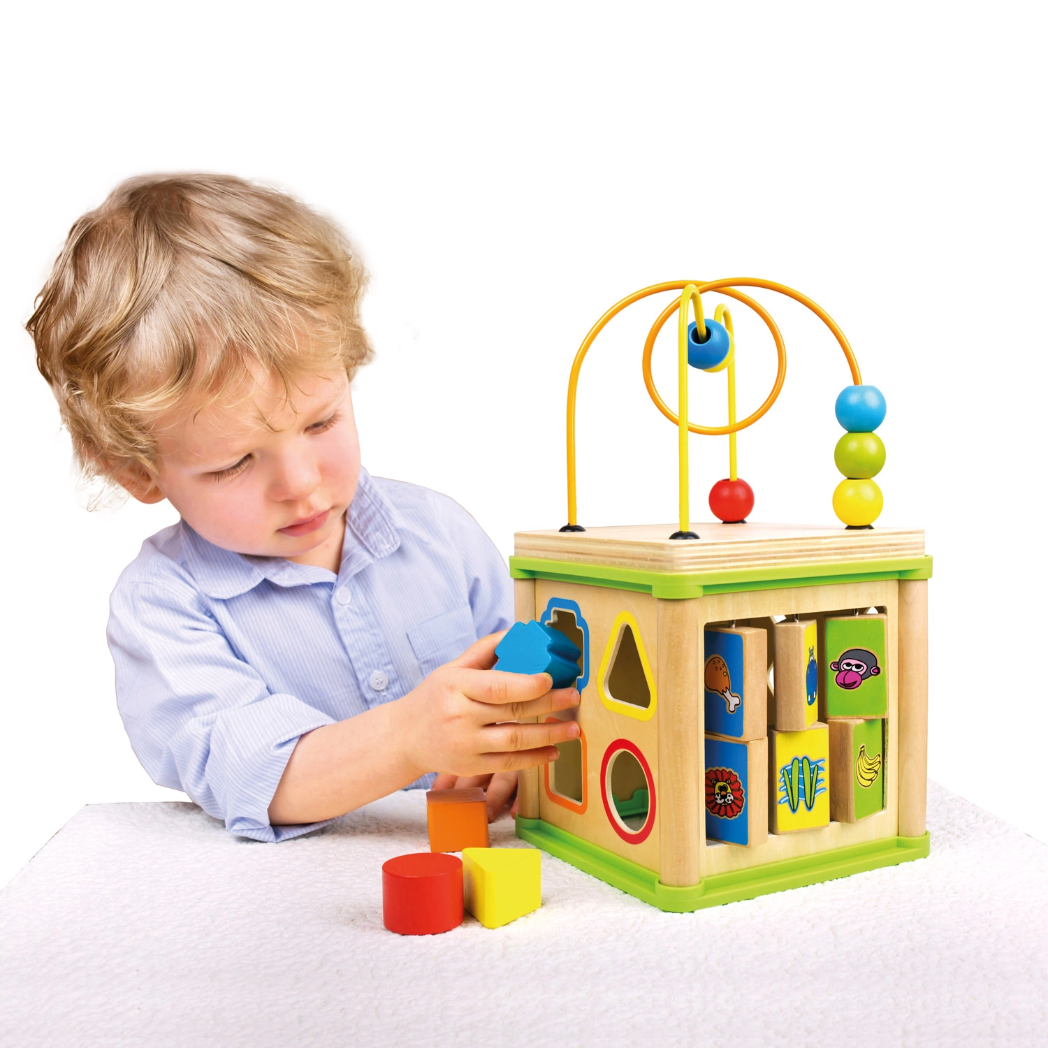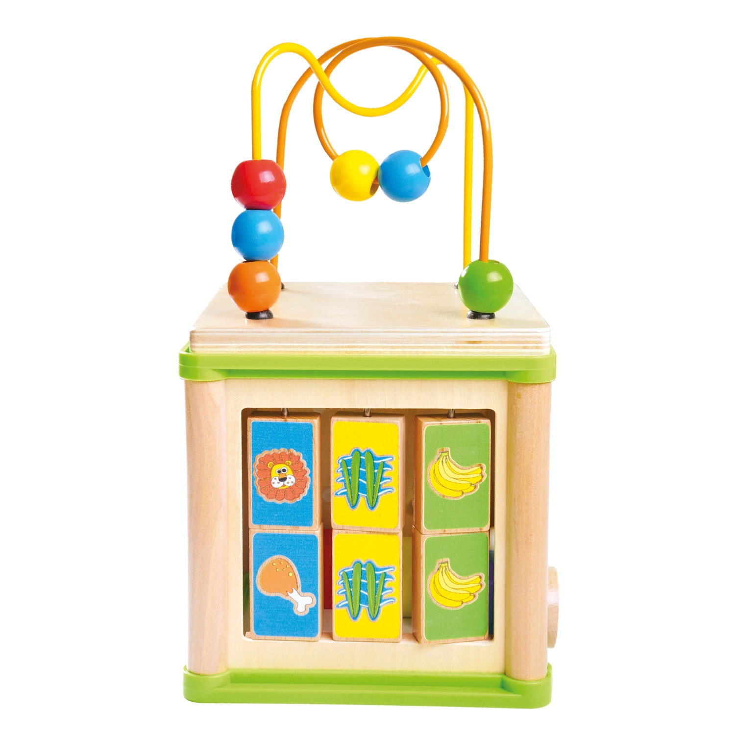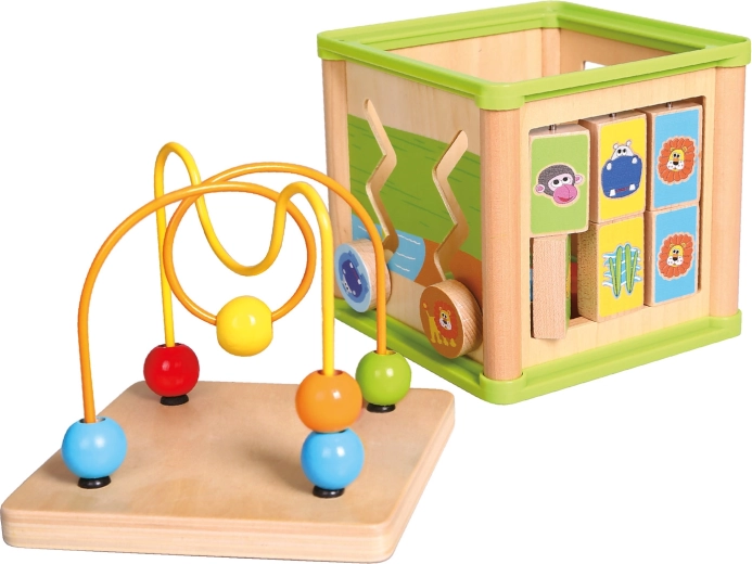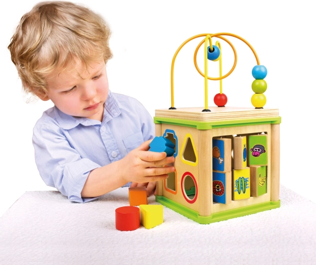 Ta wszechstronna drewniana aktywna kostka łączy pięć atrakcyjnych elementów zabawy w jednym kompaktowym wydaniu. Dzieci mogą dopasowywać zwierzątka do ich pożywienia, prowadzić koraliki po krętych torach, poznawać działanie zębatych kółek lub trenować sorter kształtów. Górną część tworzy labirynt z koralikami, który wspiera koordynację oko–ręka i koncentrację.