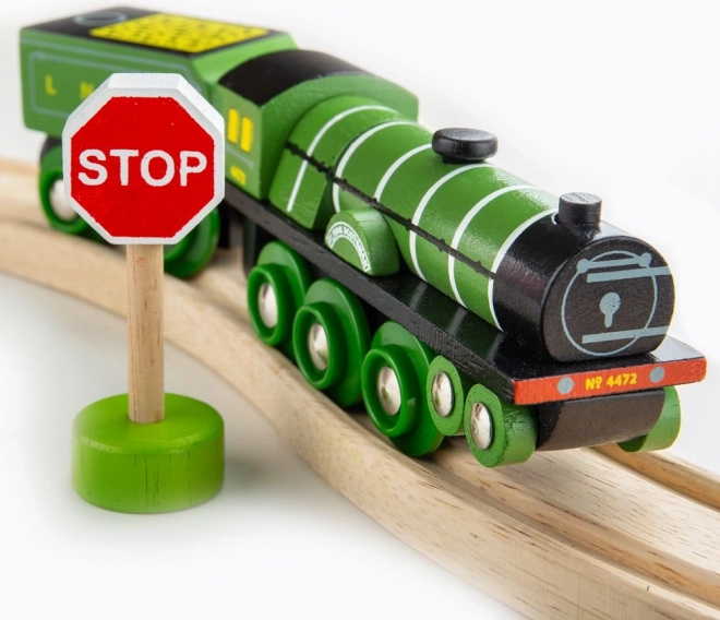 Ta drewniana lokomotywa Flying Scotsman od marki Bigjigs Rail przynosi kawałek historii do Twojego domu. Zestaw zawiera 1 sztukę lokomotywy, 1 sztukę wagonika i 3 sztuki torów. Lokomotywa wykonana jest z wysokiej jakości i odpowiedzialnie pozyskiwanych materiałów naturalnych, co gwarantuje jej wiarygodność i spełnia rygorystyczne europejskie normy.