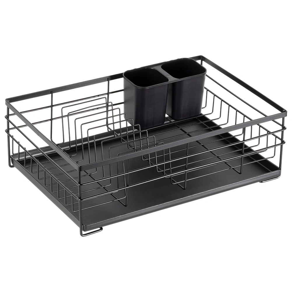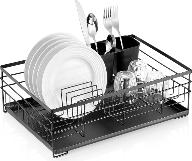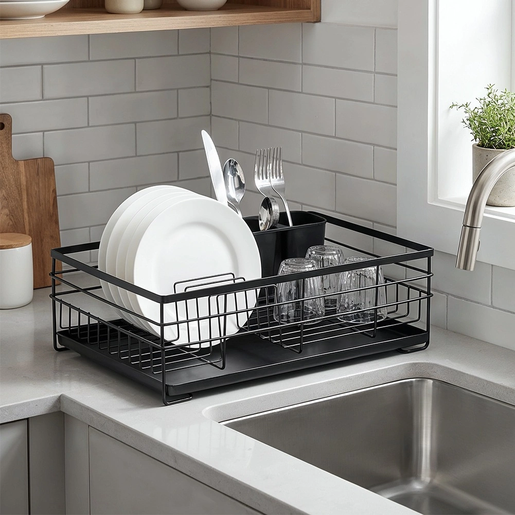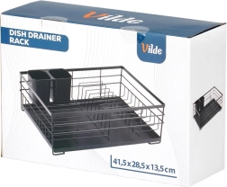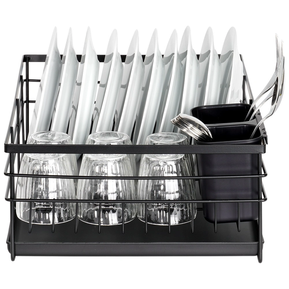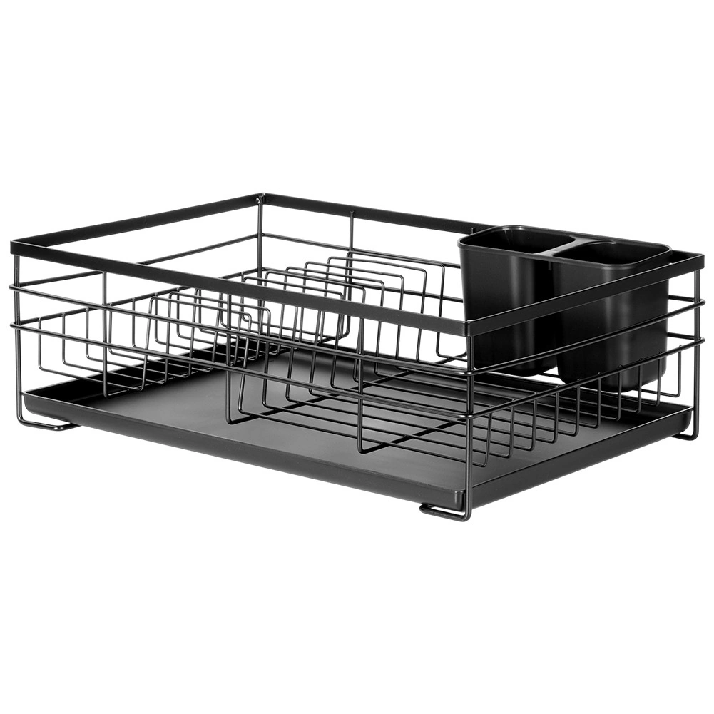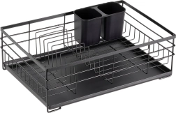 Praktyczny i stylowy ociekacz na naczynia w czarnym kolorze do przejrzystego suszenia talerzy, szklanek i sztućców. Oferuje dużą pojemność, wytrzymałą metalową konstrukcję oraz wyjmowaną tackę ociekową, która chroni blat kuchenny przed wodą.