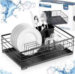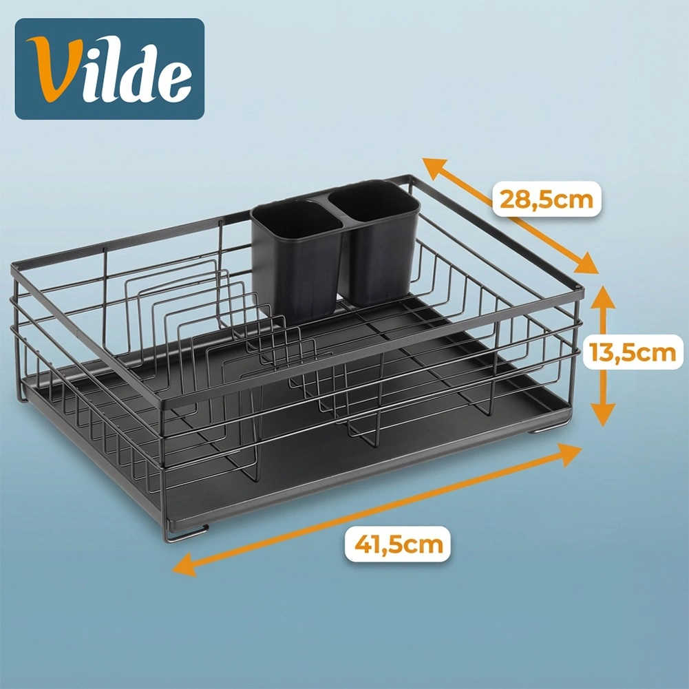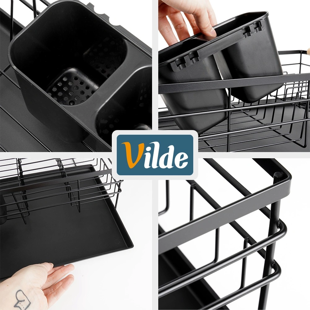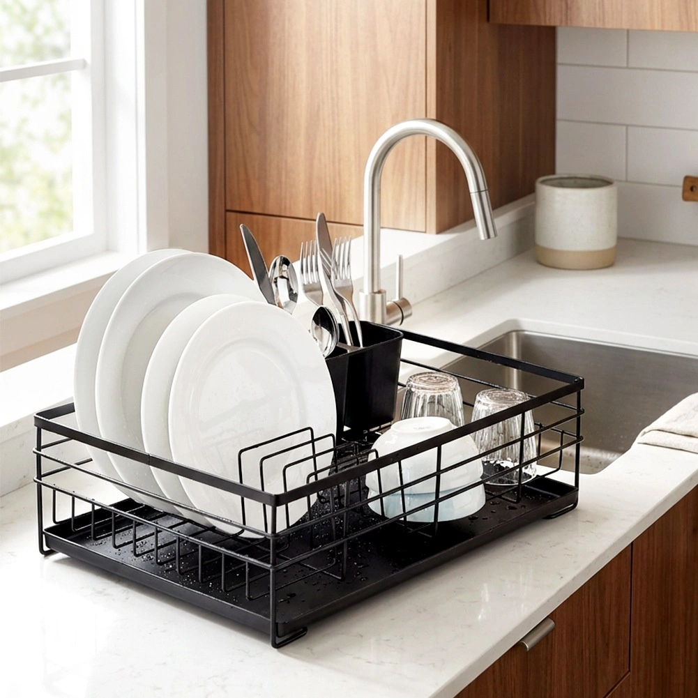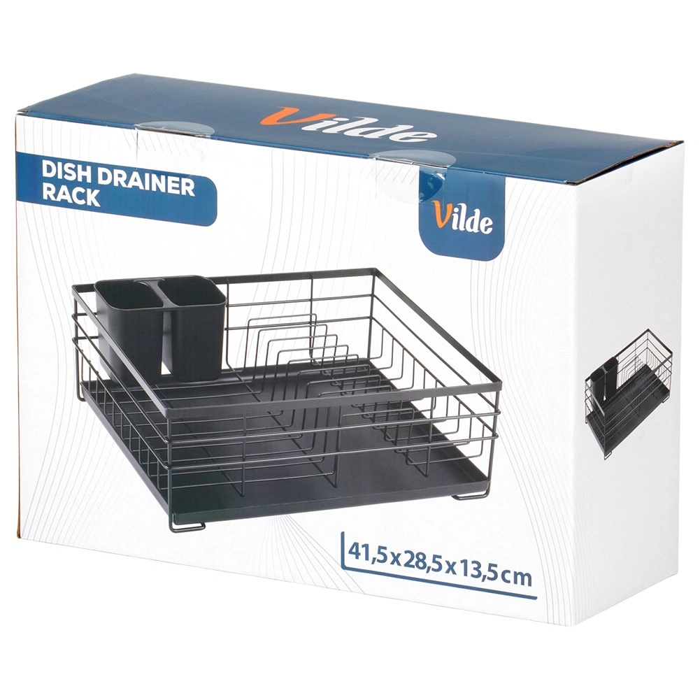 Praktyczny i stylowy ociekacz na naczynia w czarnym kolorze do przejrzystego suszenia talerzy, szklanek i sztućców. Oferuje dużą pojemność, wytrzymałą metalową konstrukcję oraz wyjmowaną tackę ociekową, która chroni blat kuchenny przed wodą.