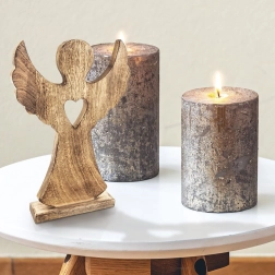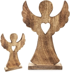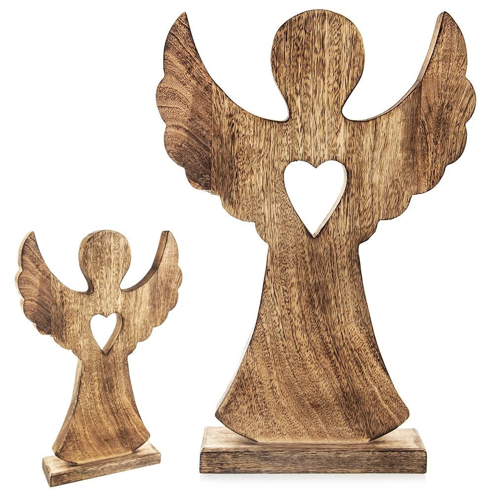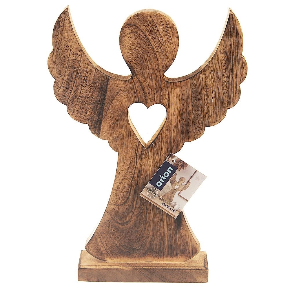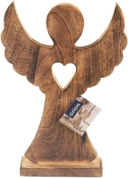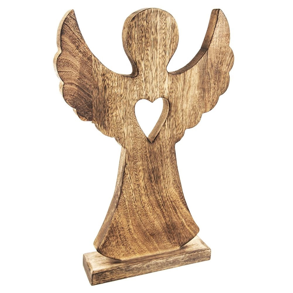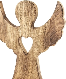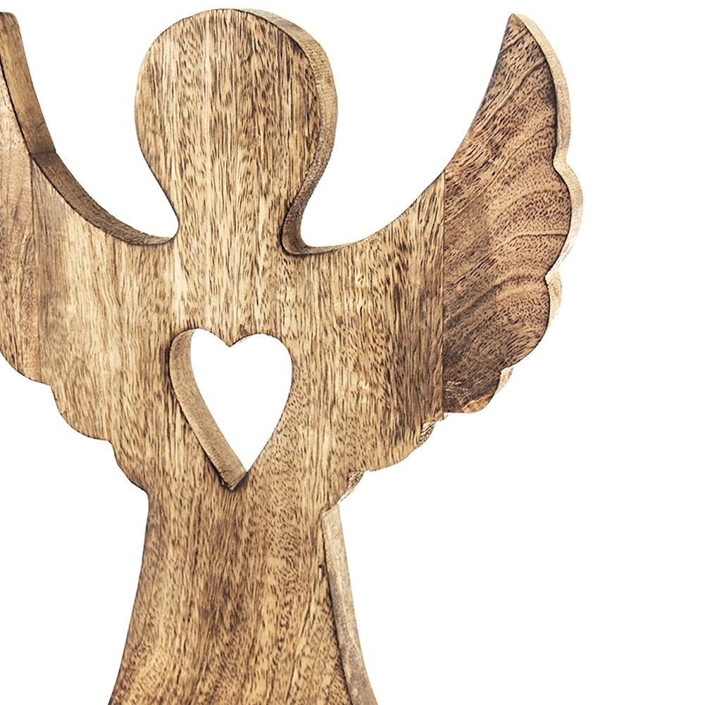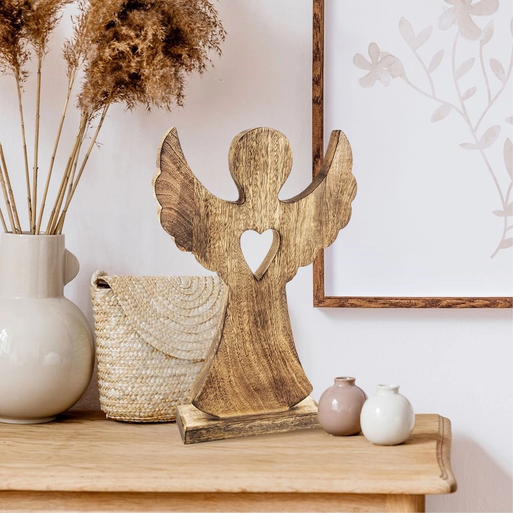 Dekoracyjny anioł z naturalnego drewna mango wyróżnia się naturalnym rysunkiem i czystymi liniami. Wycięcie w kształcie serca dodaje subtelnego, osobistego akcentu, który pasuje zarówno do nowoczesnych, jak i tradycyjnych wnętrz. Stabilna prostokątna podstawa gwarantuje bezpieczne ustawienie na półce, komodzie czy parapecie okiennym.