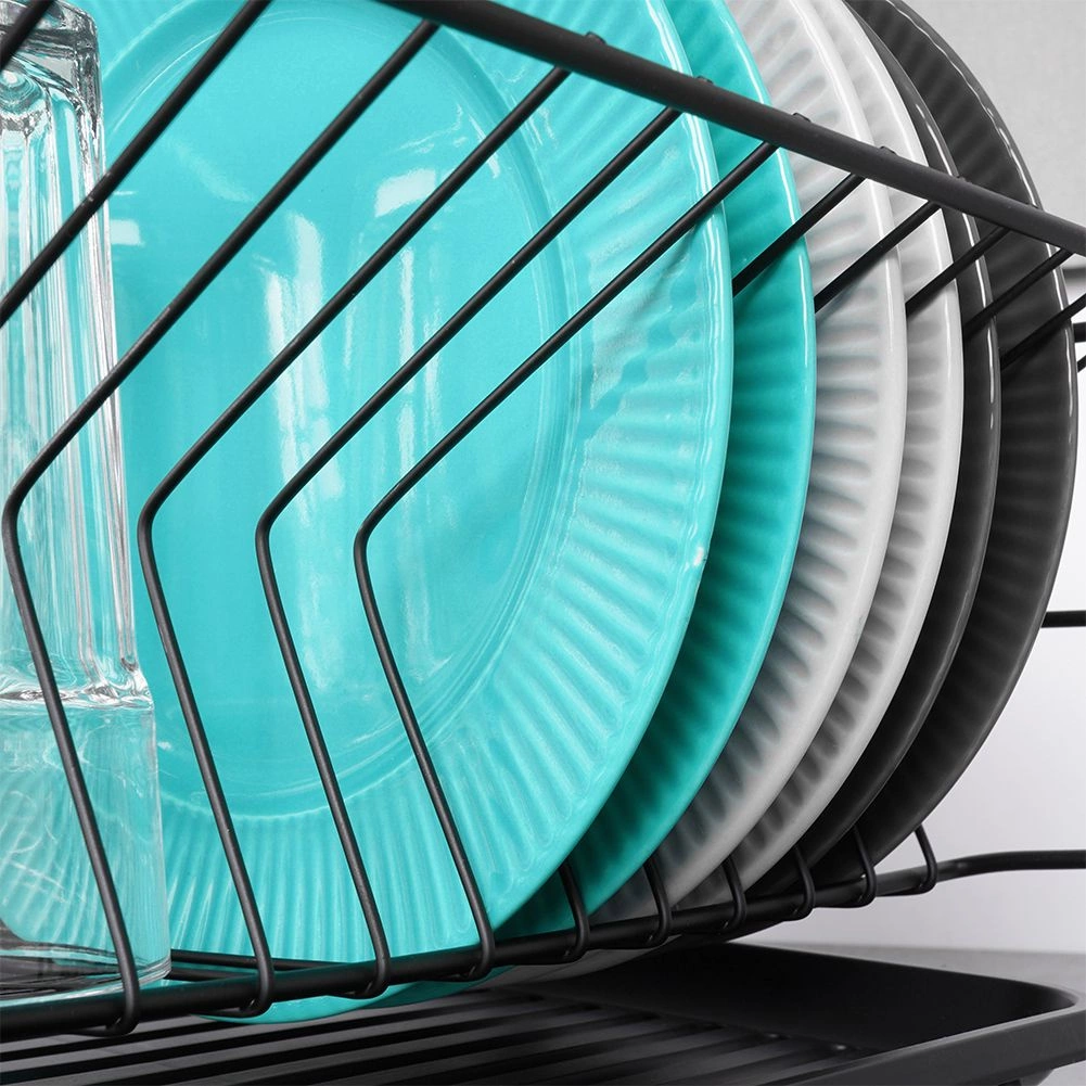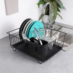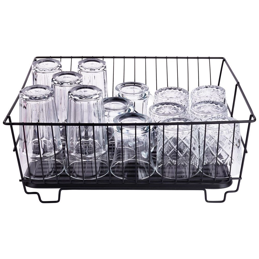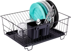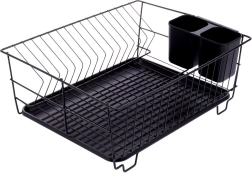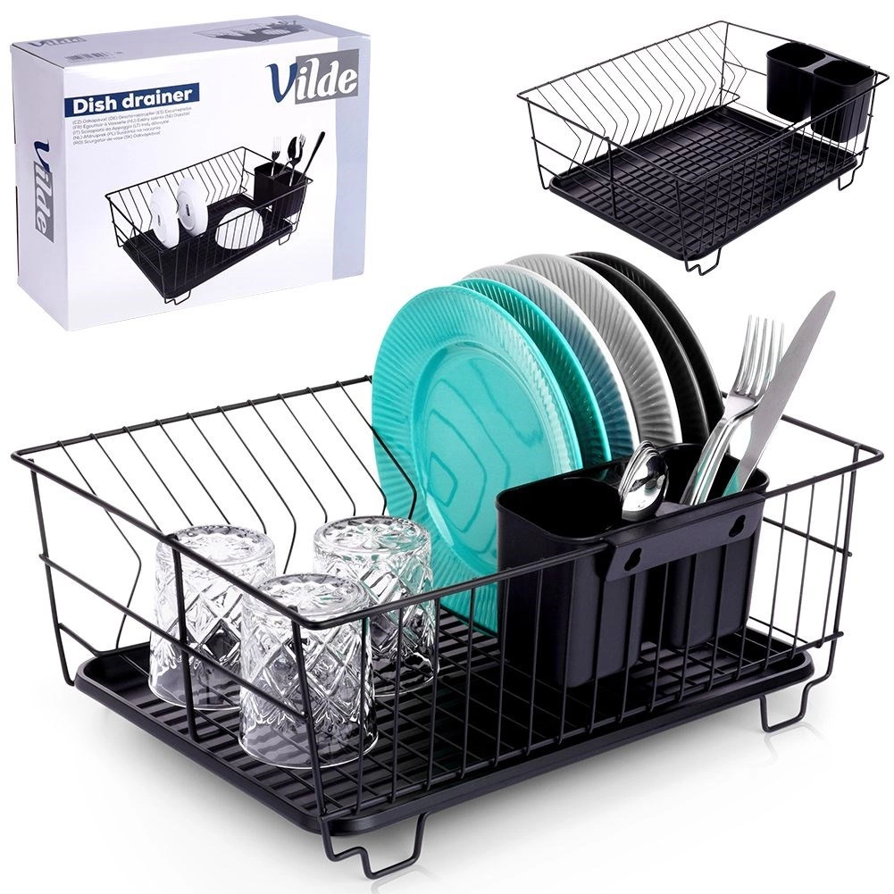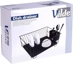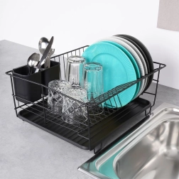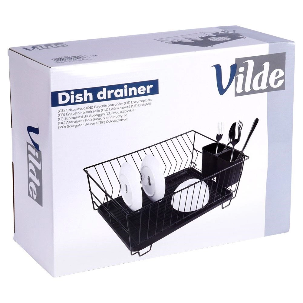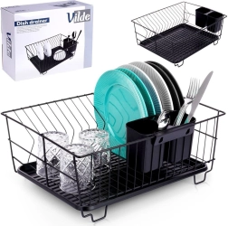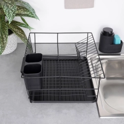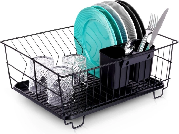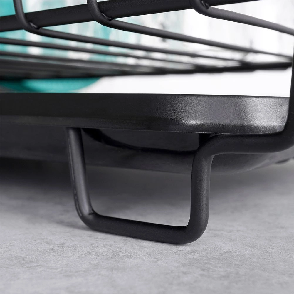 Stylowy i funkcjonalny ociekacz do naczyń z wytrzymałego metalu w matowej czerni łączy nowoczesny loftowy design z codzienną praktycznością. Zapewnia dedykowane miejsca na nawet 15 talerzy oraz sporo przestrzeni na szklanki, miski i większe elementy zastawy. Wyjmowana plastikowa taca ociekowa zbiera wodę i utrzymuje powierzchnię roboczą w suchości.
